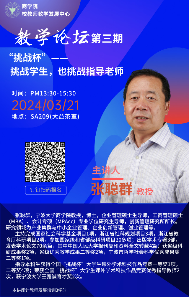 张聪群,宁波大学商学院教授,博士,企业管理硕士生导师,工商管理硕士(MBA)、会计专硕(MPAcc)专业学位研究生导师,创新管理研究所所长。担任宁波市民营企业家协会专家组成员,宁波市小微企业创业创新导师团首批导师。
