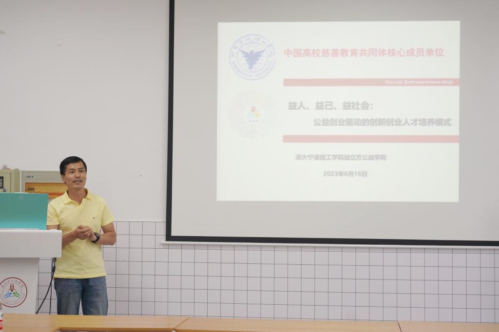 接着,商学院副院长鞠芳辉教授介绍了益立方公益学院的情况。他从益立方名字由来、职能、理念等方面进行了阐述,重点强调了益立方公益学院致力于为社会培养具有创新精神和社会责任感的优秀人才的宗旨。鞠芳辉还分享了益立方公益学院在实践中取得的成绩和未来的规划。