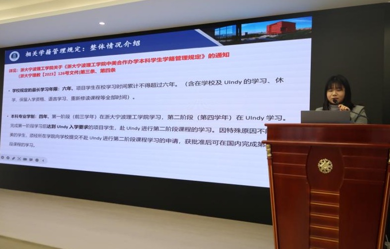 励呈仪老师详细解读了中美班在学籍管理规定和毕业、学位资格审核方面的要求,系统介绍了下学期赴美申请的要求、流程及注意事项,鼓励学生强化英语语言学习,尽早做好相关准备,为顺利赴美学习打下坚实的基础。
