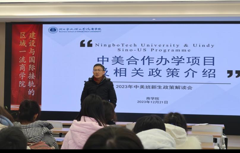 12月21日中午,2023年中美班新生政策解读会在SC412顺利举行。学校国际合作与交流处副处长程萌,商学院党委副书记、纪委书记吴琼,商学院院长助理李雪艳出席会议,商学院国际交流中心励呈仪、中美班辅导员张楚铭、吴佼及班导师刘彬、丁宁和全体中美班新生参加会议。
