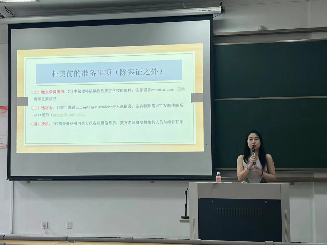 吴琼老师对中美合作办学项目的学籍管理规定做了详细解读,引导同学们合理安排赴美学习计划。她提醒同学们在外要热爱祖国,遵守当地法律法规,同学之间互帮互助,定期与学院老师沟通在美国的学习、生活情况。