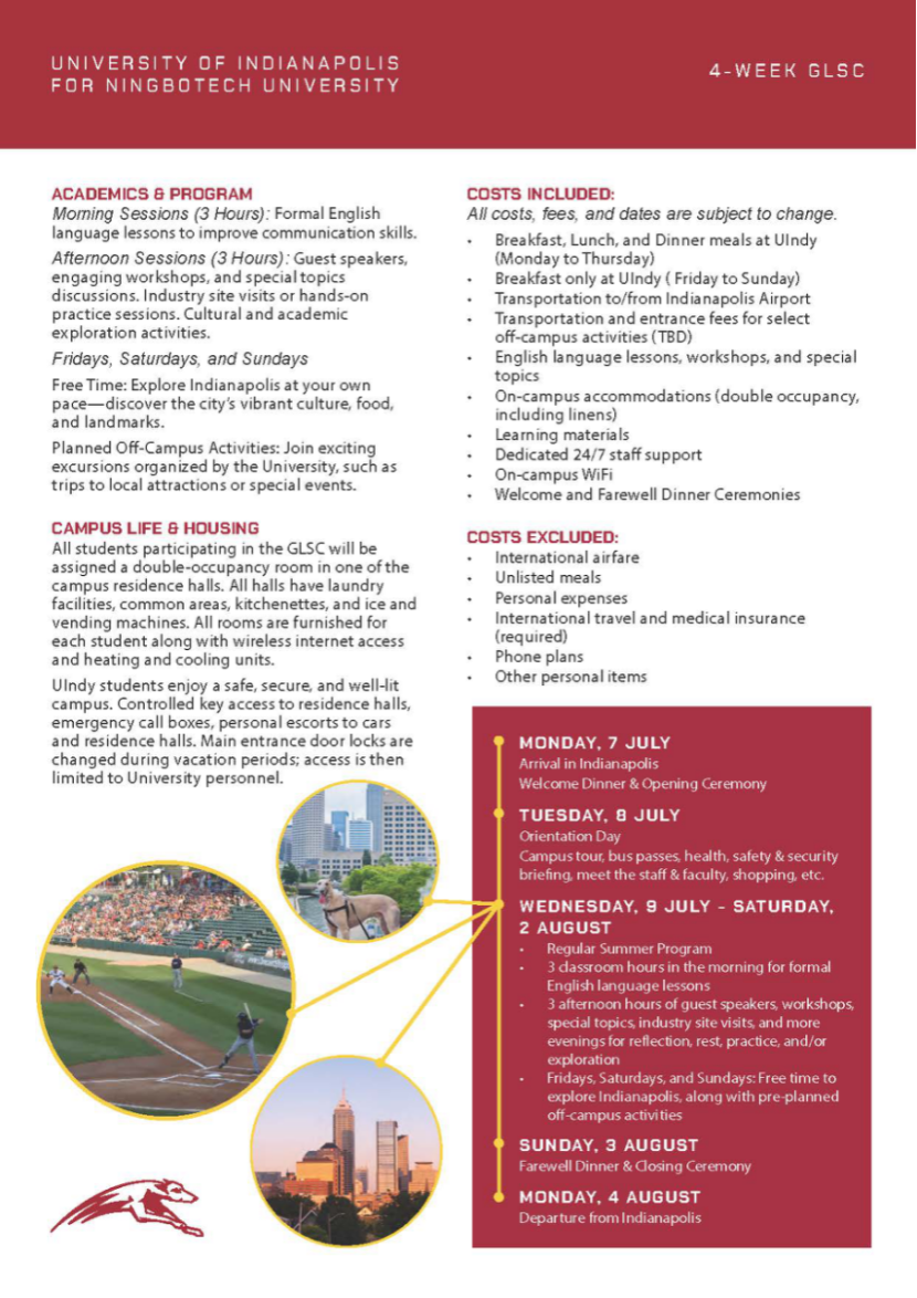 包括学费、住宿费(校内住宿双人间,包括床单)、餐费(UIndy周一至周四早餐、午餐和晚餐以及周五至周日的早餐)、接机其他部分交通、入场费、校园活动、UIndy员工全天候支持、校园WiFi、欢迎和告别晚宴。