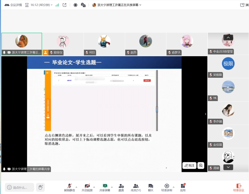 许老师围绕毕业论文构成、撰写要求、成绩评定标准、选题和关键节点等内容,具体详细地给同学们解读了相关要求,并针对往年容易犯错的内容进行重点提醒,同学们纷纷表示非常有帮助。最后,许老师祝福同学们在美学习生活、以及毕业论文都顺利圆满。