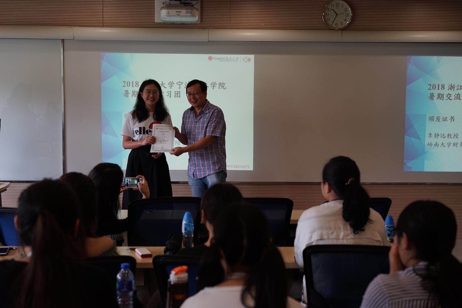 7月14日,商学院师生完成了本次在香港学习交流的所有课程和实地调研,上午10点在岭南大学欧阳海演讲室举行了本次学习交流活动的结业礼。结业礼上,岭南大学商学院保险与会计系主任李静远教授对本次学习交流活动进行了总结,对同学们的学习热情和态度给予了充分肯定,并为参加本次研习活动的师生颁发了结业证书。
