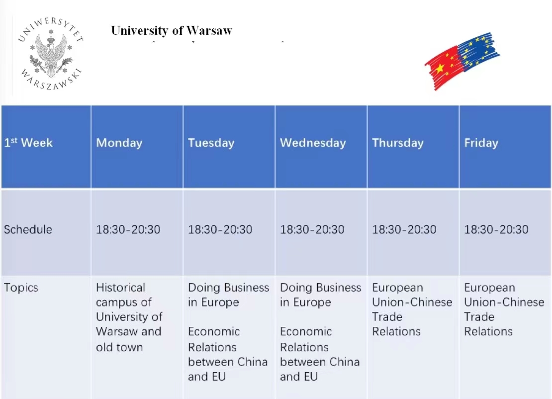 2019年暑假期间,学校组织部分学院学生前往波兰华沙大学进行为期三周的暑期交流学习。通过三周的学习,同学们对于华沙大学的环境氛围以及教师英文授课的模式都非常适应。华沙大学开设的专业课程让同学们受益匪浅,沉浸式地体验了海外学习模式,与同样参加项目的来自乌克兰、阿塞拜疆等国的交流学生开展课堂小组互动与展示,更深入地了解了东欧文化的特色。同时,学生有机会参访当地的波兰议会、华沙议会以及华沙证券交易市场等,提升了学术素养,开拓国际视野。