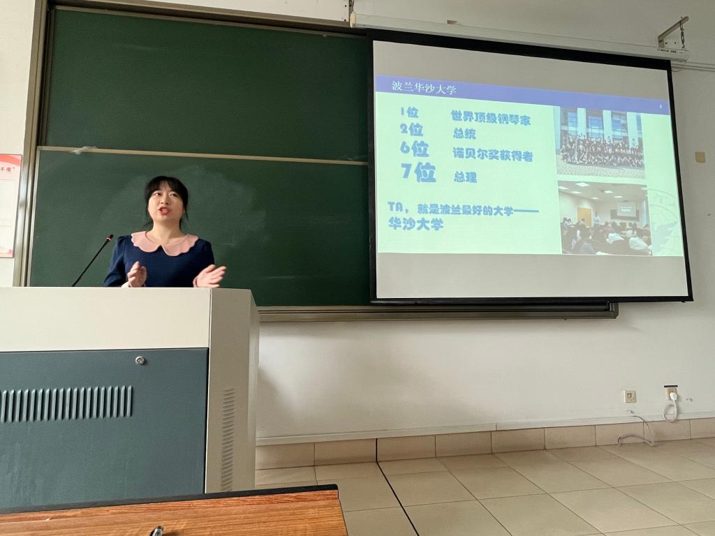 吴琼老师首先向在场学生介绍了我校开展暑期境外交流活动和校际合作的情况,鼓励同学们积极“走出去”,利用暑假时间体验海外优质课程。我校与波兰华沙大学紧密合作,2019年传法学院师生前往华沙大学暑期交流,2022年商学院组织两次在地国际化项目,多位参与项目的同学受益匪浅,已将在地国际化项目的课程内容融入自己的毕业论文设计中。