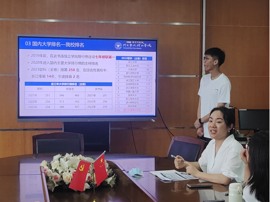 其次,李老师还普及了大学的三大职能,即人才培养、科学研究和社会服务。接着,她引出了大学排行榜的概念来源和国内外主流的排行榜。通过李老师的介绍,党员同志们明晰了世界大学排名主要有软科世界大学学术排名、THE世界大学排名、QS世界大学排名和U.S.News世界大学排名;国内大学排名主要有软科中国大学排名、武书连中国大学排行榜、校友会中国大学排行榜和金平果排行榜。而我校在浙江省高校中排名第14位,在宁波市高校中排名第2位,支部党员纷纷表示对学校向好发展的认同感与自豪感。