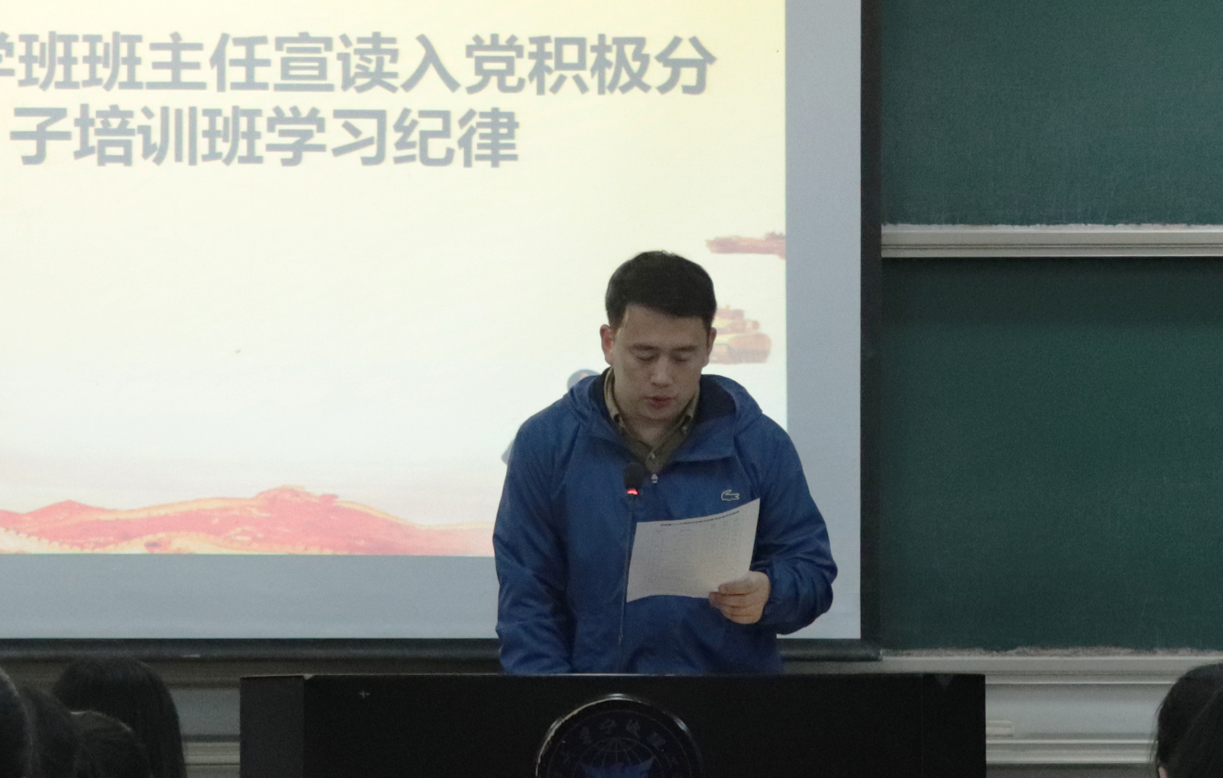 班主任马双龙讲话,他强调,入党积极分子培训班旨在加深同学对党的认识,端正入党动机,坚定入党决心,从思想和行为两个方面不断严格要求自己,争取早日加入党组织。随后,他宣读培训班的学习纪律,介绍未来课程安排及考核方式,并表达了对培训班学员的肯定及对未来发展的殷切期望。