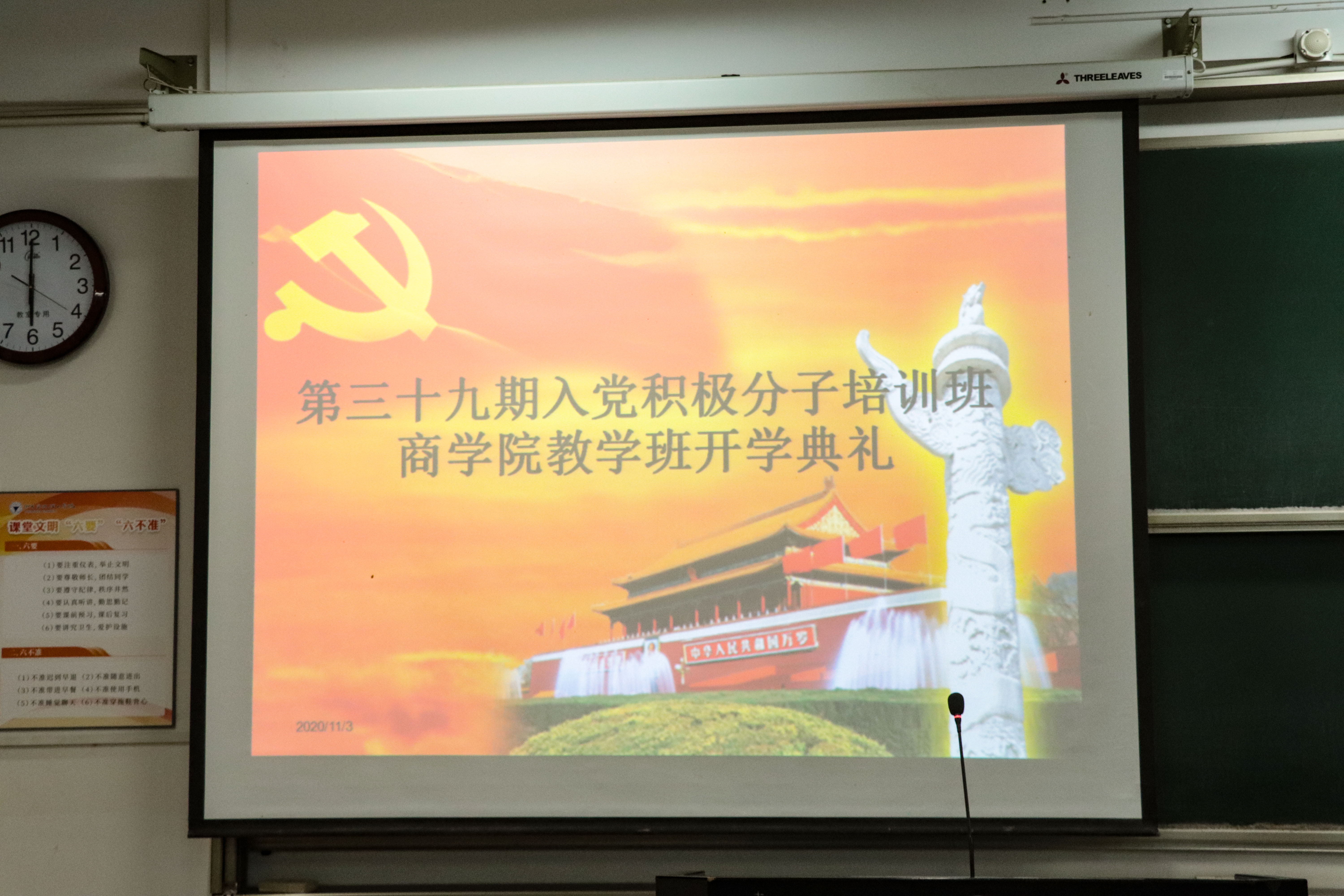 2020年11月3号晚,商学院举行第三十九期入党积极分子培训班开班典礼,学工办马双龙老师、陈鑫老师及第三十九期培训班全体学员参会。