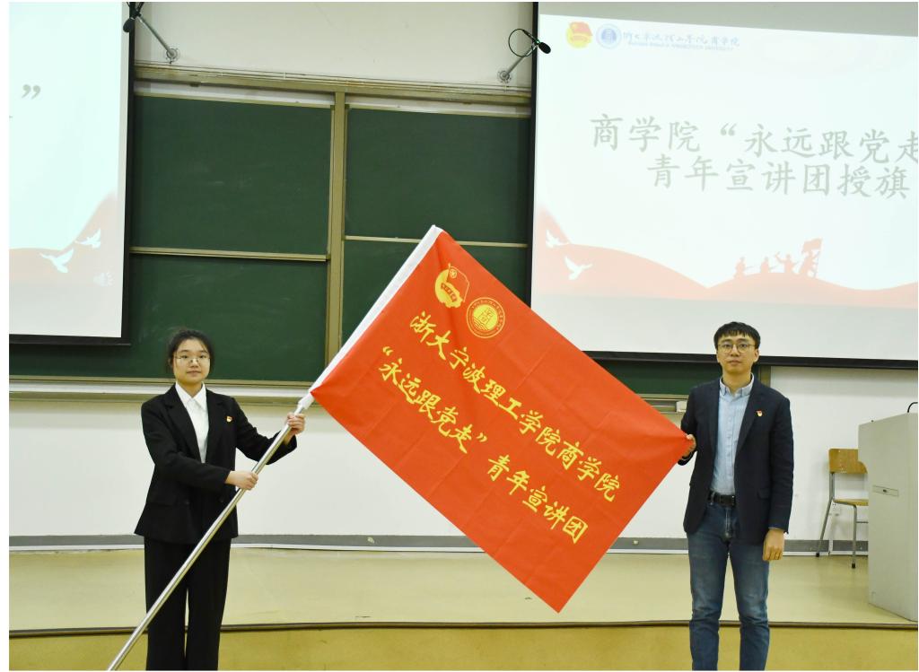 接着,商学院思政副主管潘剑邦老师为“永远跟党走”青年宣讲团授旗,党员教育发展中心主席蒋刘悦同学作为代表上台。
