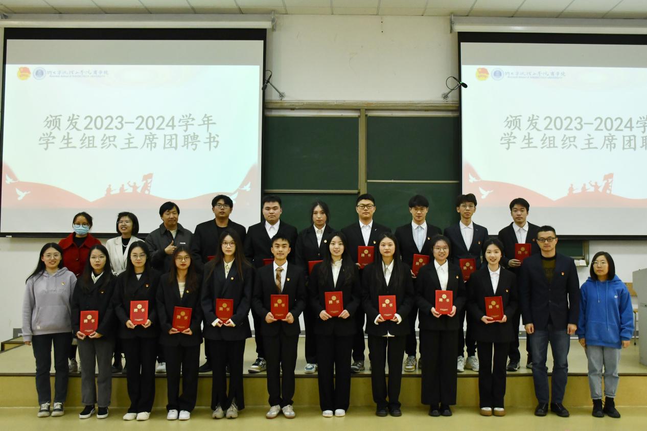 之后,吴琼老师为2023-2024学年团委书记、副书记颁发聘书,张楚铭老师为2022-2023学年主席团主席颁发考核证书。学工办老师们分别为新一届主席团主席以及各学生组织部长颁发聘书。