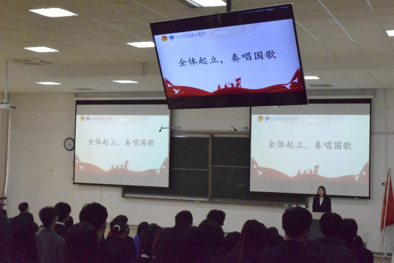 会议伊始,激昂的国歌响起,全体起立,奏唱国歌。