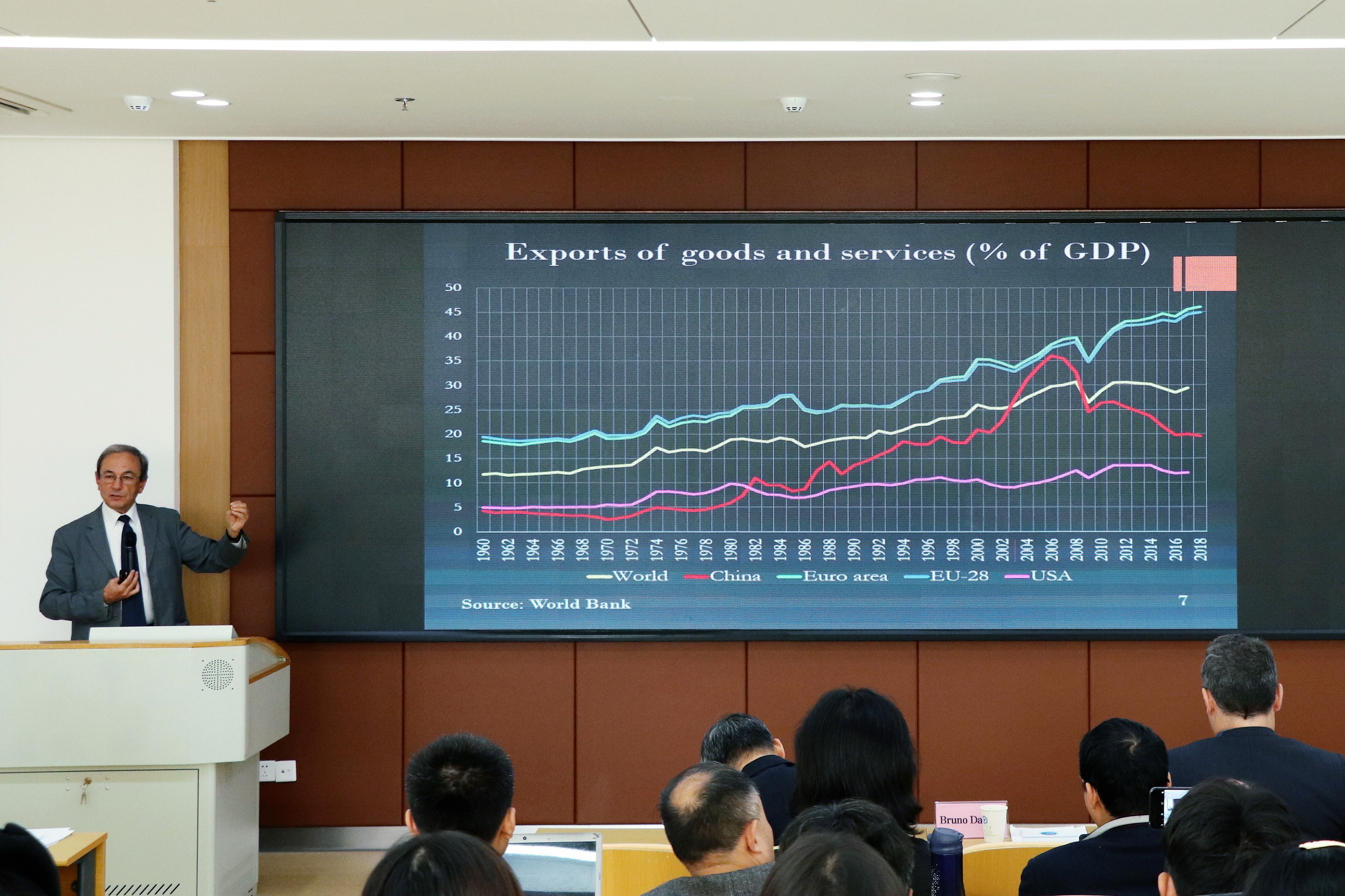 会议分上下两个半场进行。上半场首先由意大利特伦托大学经济与管理系资深教授Bruno Dallago为大家做了题为“经济增长的挑战—一带一路倡议能在欧盟和中国承担战略角色吗?”的报告。他分析了中欧经济面临的问题,比较了中欧的异同和一带一路倡议的优势与劣势,最后阐述了欧盟对一带一路倡议的立场。