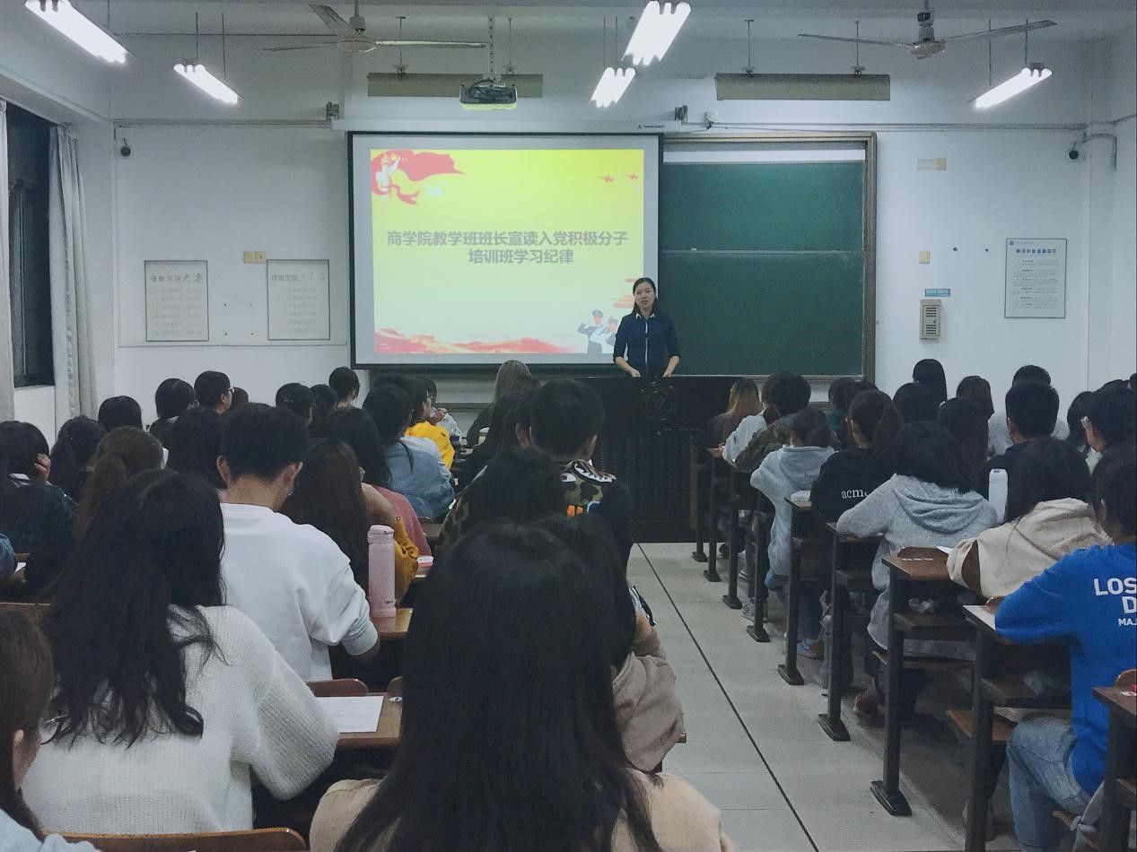 首先全体起立奏唱国歌,随后培训班班主任柯乐乐老师进行了动员讲话,党教培训班班长徐欢欢上台宣读入党积极分子培训班学习纪律。之后,商学院党委副书记周丽娟老师给入党积极分子提出了新的要求。最后全体起立奏唱《国际歌》,班长宣布开学典礼顺利结束,伍醒老师开始第一节课——新时代与新青年。