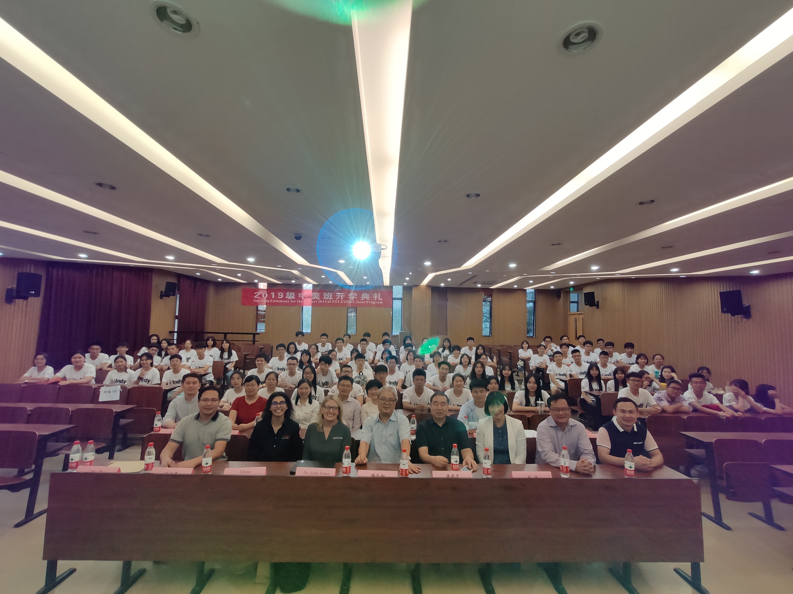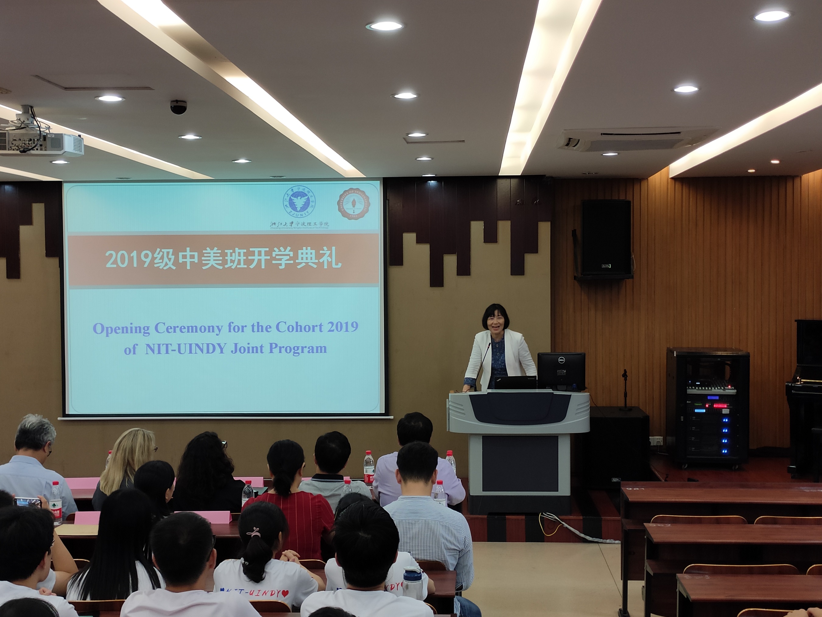 2019年9月24日下午,中美班2019级新生美方开学典礼在NC103举行。浙江大学宁波理工学院副院长梅乐和、教务处处长潘再平、美国印第安纳波利斯大学(UIndy)副教务长Jodie Ferise、招生入学办公室项目联络人Ghina George-Sadek、商学院院长肖文、常务副院长林承亮、副书记周丽娟、外事处副处长程萌及部分教师代表出席了开学典礼,金融与贸易系丁宁主持开学典礼。