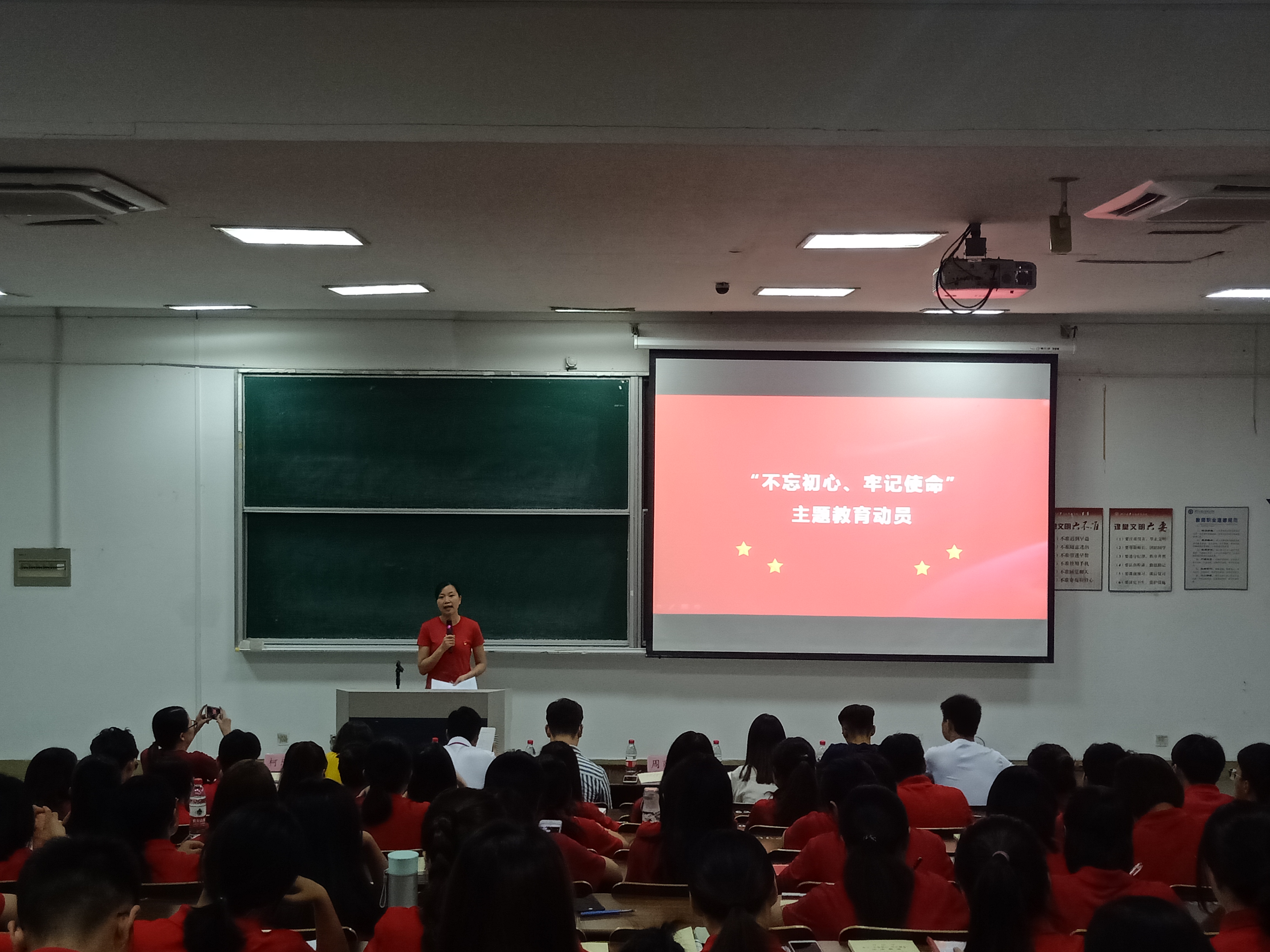 随后商学院党委副书记周丽娟老师上台进行“不忘初心、牢记使命”主题教育动员。周丽娟指出,主题教育中要发挥学生党员干部的先锋模范作用,充分发挥基层党组织的战斗堡垒作用。周丽娟副书记就主题教育的动员部署提出具体要求。一是要提高政治站位,深刻认识开展主题教育的重大意义。二是要深化学习教育,准确把握主题教育目标要求。三是要加强组织领导,确保主题教育取得实效。她要求全体学生党员要把握“守初心、担使命、找差距、抓落实”的总要求,认真对照党章党规,勇于解剖自己内心,用实际行动深化对党的初心,不断提升自我,确保主题教育取得实效。