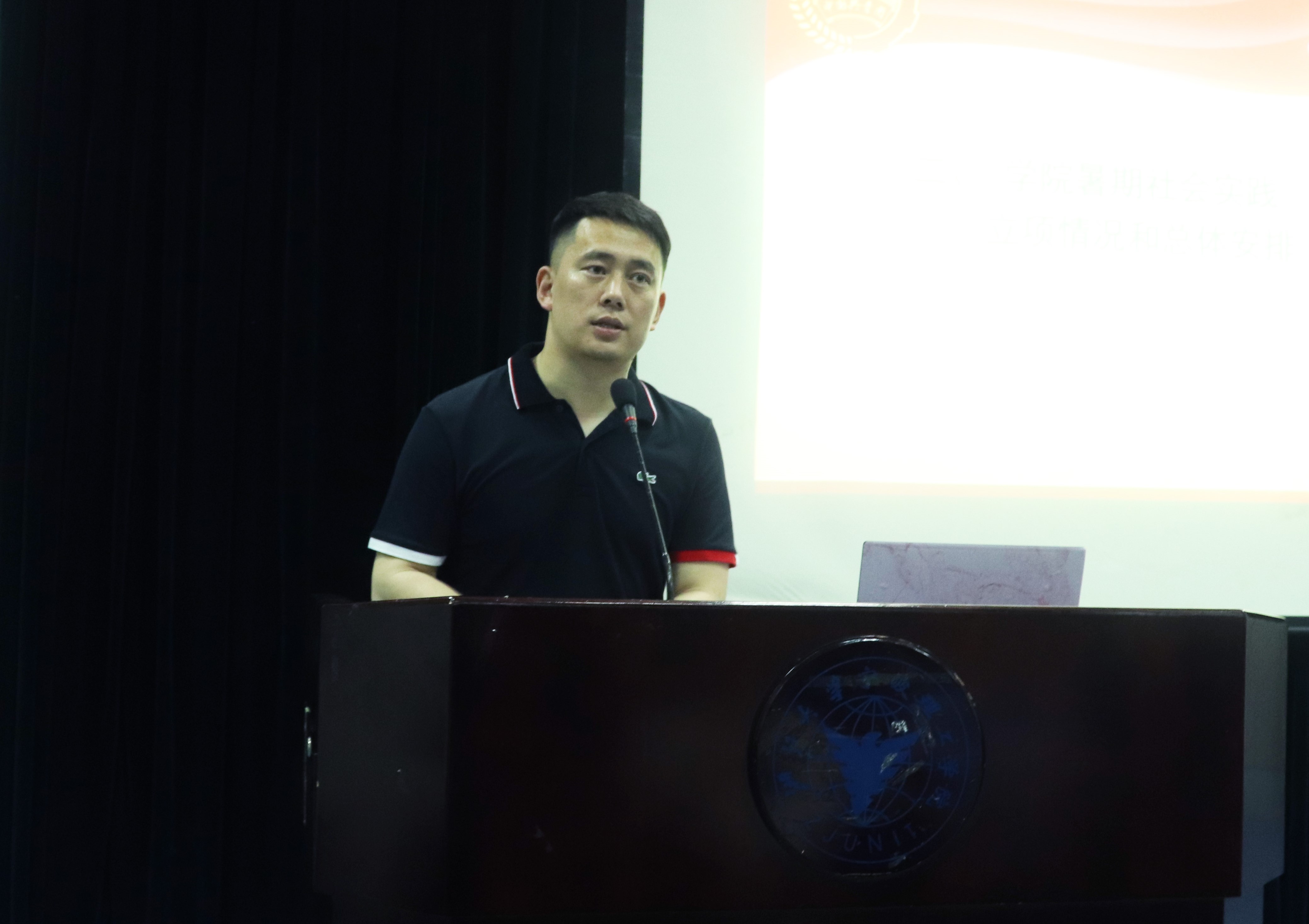 6月27日晚6点30分,商学院在NF103举办了2019年暑期社会实践出征仪式,商学院党委副书记周丽娟、学工办副主管马双龙、学工办包静昇、李渊四位老师及各暑期社会实践队伍负责人出席参加本次大会。团委实践部梅何薇同学担任主持人。