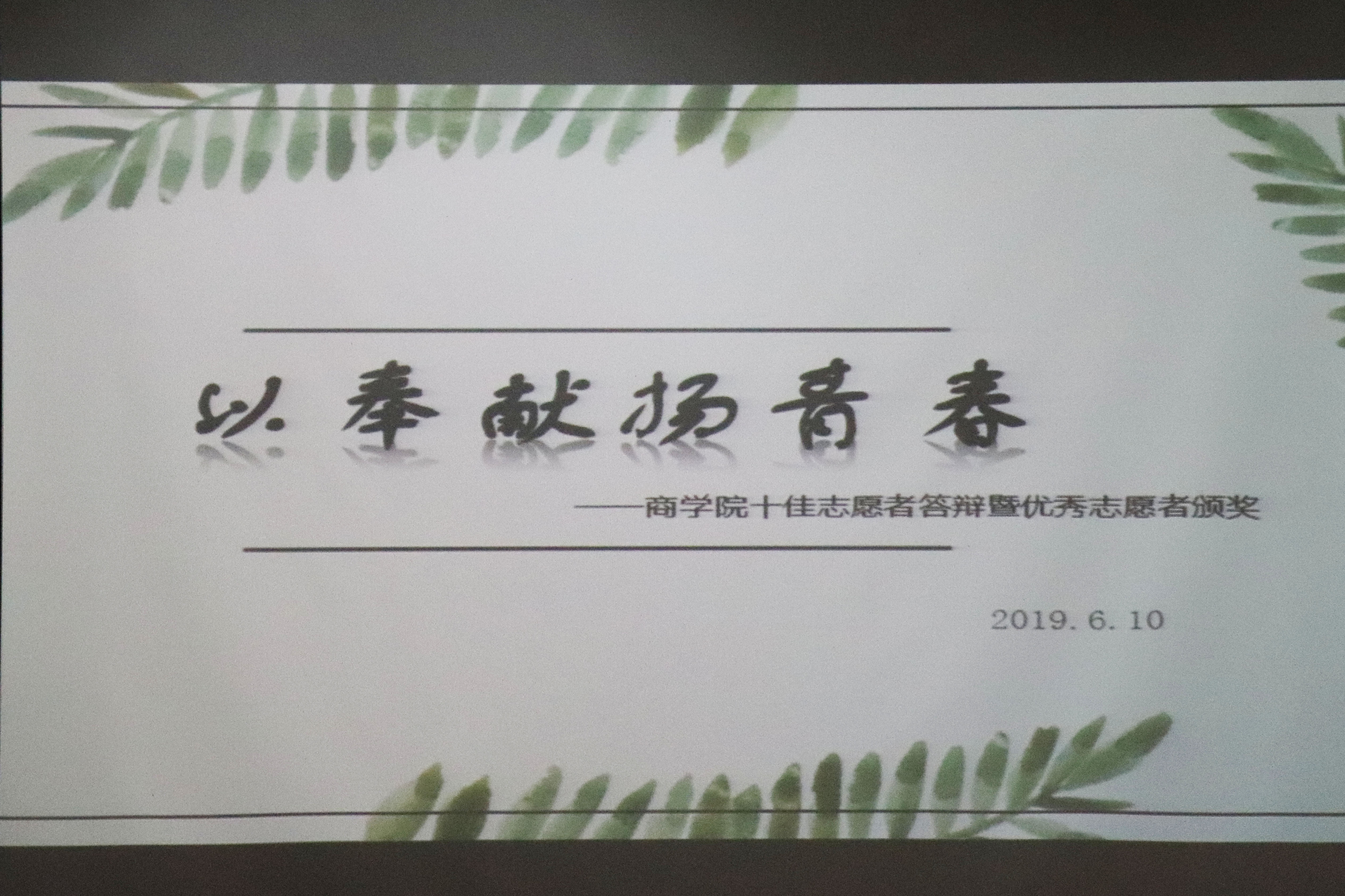 6月10日晚6: 30,商学院于sb104举行十佳志愿者评比暨优秀志愿者表彰大会。校青协会长张延友、商学院青协会长张甜、商学院青协副会长洪紫荆、商学院青协副会长宋超群,外语学院青协会长潘婷、数据学院青协副会长章宗沈、信息学院青协会长李益权、机能学院青协会长黄敏、法政学院青协会长徐铭萱、随手公益理事长陈哲汀出席担任评委。商院青协全体成员及各级学子积极到场。