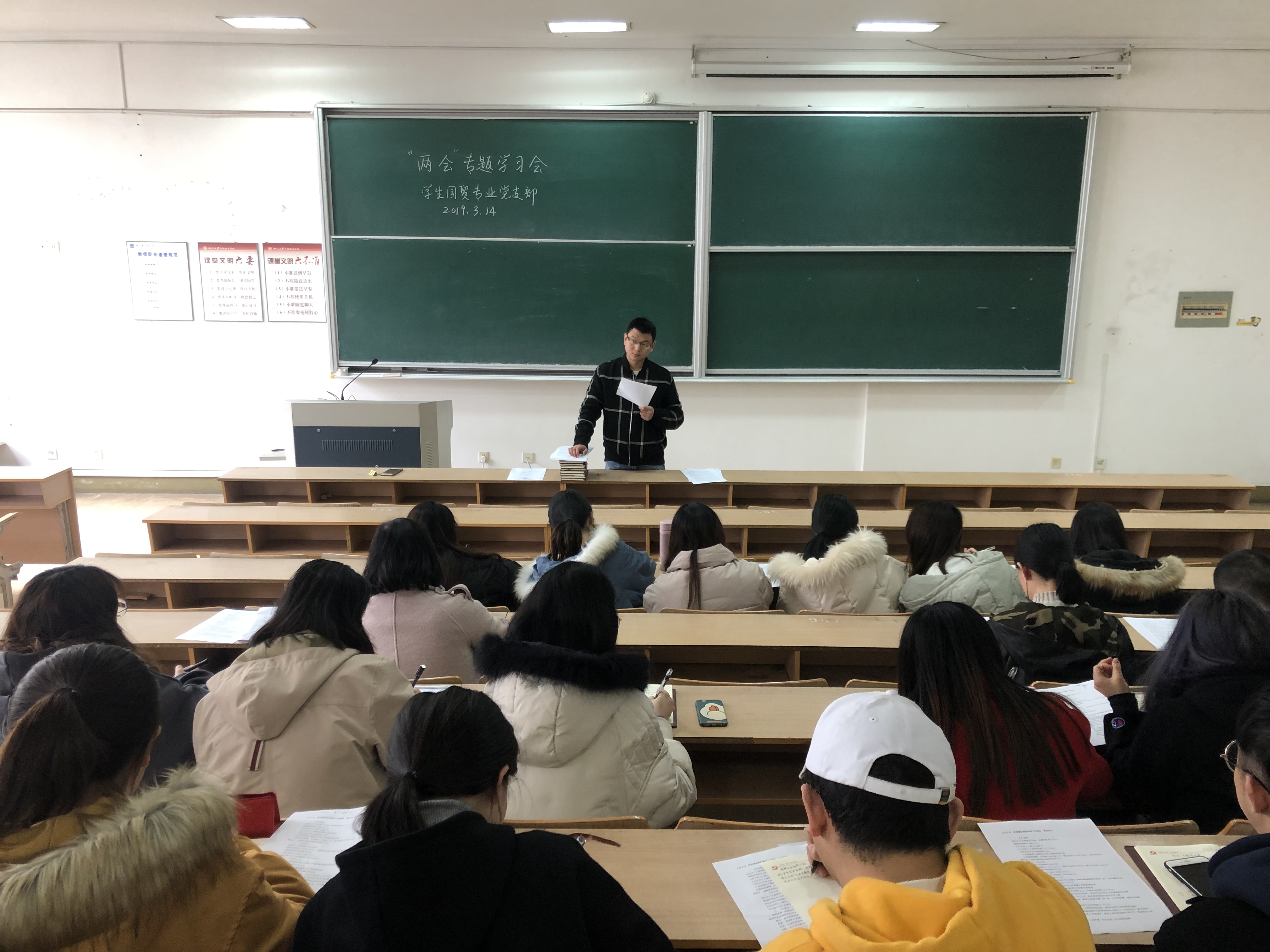 3月14日下午,学生国贸专业党支部在sc218举行两会专题学习会。支部党员及入党积极分子参加学习会。支部书记陈鑫老师首先向大家解读了今年两会的议程、性质和历史地位,然后详细解读了李克强总理作的政府工作报告,将报告中的新提法、新思想、新政策一一作了阐释,还在会前给同学们下发了精简版的报告要点供大家识记。