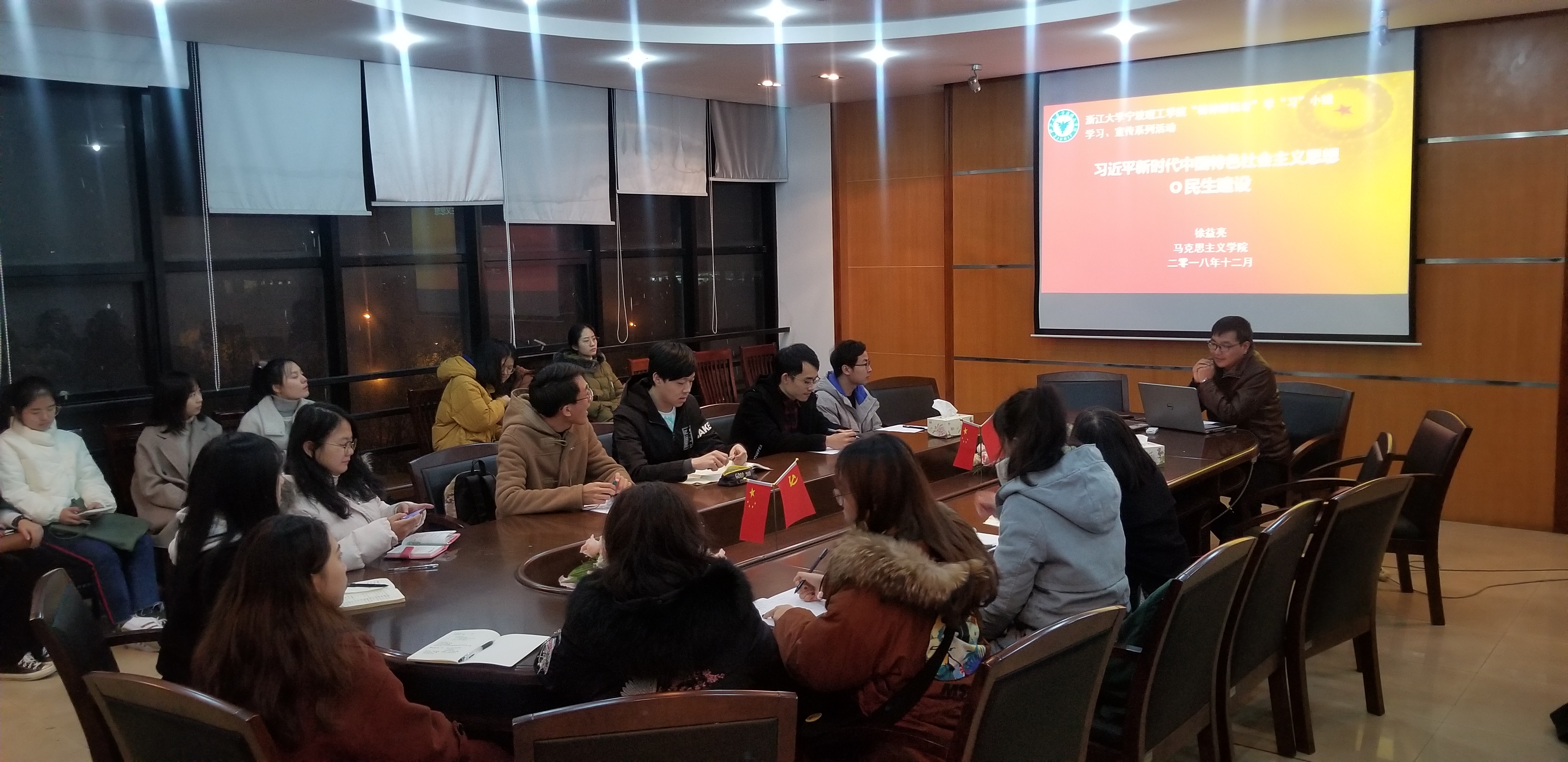 习近平新时代中国特色社会主义思想内容丰富,学“习”小组成员黄钟汀同学首先围绕“决胜全面建成小康社会”这一主题进行了分享,追溯“小康”一词的起源,解析“三步走”发展战略及全面建设小康社会的发展过程、新的目标要求,层层递进,同时也从农村、收入、文化、环境等方面指出全面建成小康路上存在的问题。其次,徐益亮老师做了关于“民生建设”的主题讲座,从什么是民生、为什么要保障和改善民生、民生方面存在的问题和挑战以及怎样保障和改善民生四个方面展开,徐老师用幽默风趣又不乏深度的语言系统透彻地向党员们讲解了当下老百姓最关注的民生问题,为在场人员上了生动的一课。随后,与会人员自由发言,结合自身对习近平新时代中国特色社会主义思想的理解以及环境治理、农村问题、医疗问题等发表了自己的见解和感想。