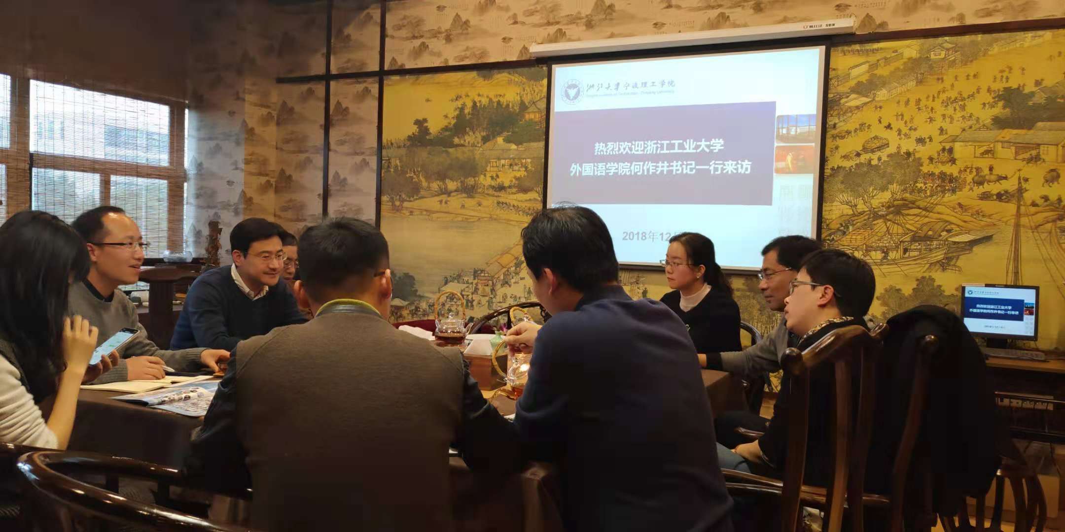 12月06日,浙江工业大学外国语学院党委书记何作井,学院党委委员、工会主席李勇、组织员李林、办公室主任朱玮一行4人来我院访问交流。学院党委书记李萍萍、工会主席朱红、工会委员陈荣,党委组织委员赵涵、党政办主任陈恩参加了此次交流会。