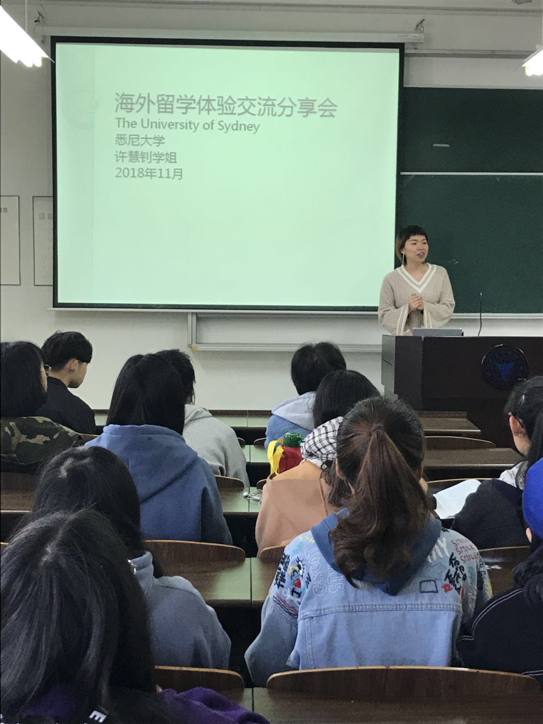 11月29日上午,留学悉尼大学的国贸毕业生许慧钊受专业邀请回校举行了一场留学体验分享会。国贸专业18级全体新生参加交流。