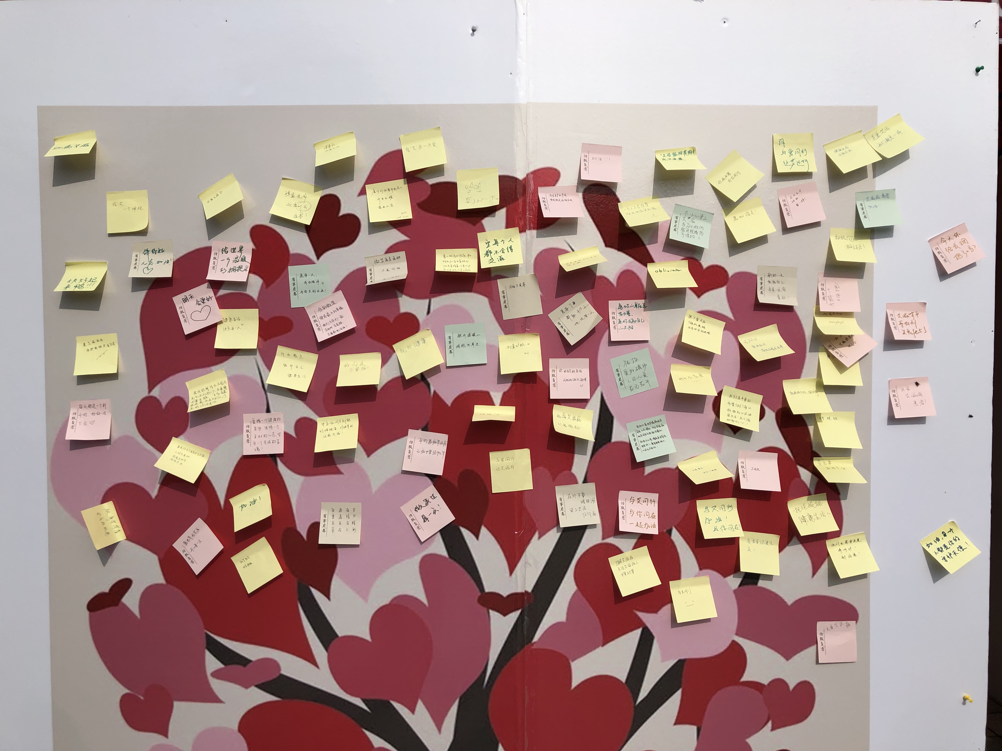 本次的明信片打卡活动有四个环节。首先是“红丝带打卡”,参加的同学需要把红丝带佩戴在身上;其次是“小问答打卡”,参与者需在问题箱中抽取一个问题并回答;“寄心语”打卡,现场设有为艾寄语展板,参与者将自己想说的话写在便利贴并粘在展板上;最后是“零歧视打卡”,参与者需拥抱我们提前招募的“艾滋病患者”志愿者。我们以拍摄影片和照片的方式记录了此次活动。