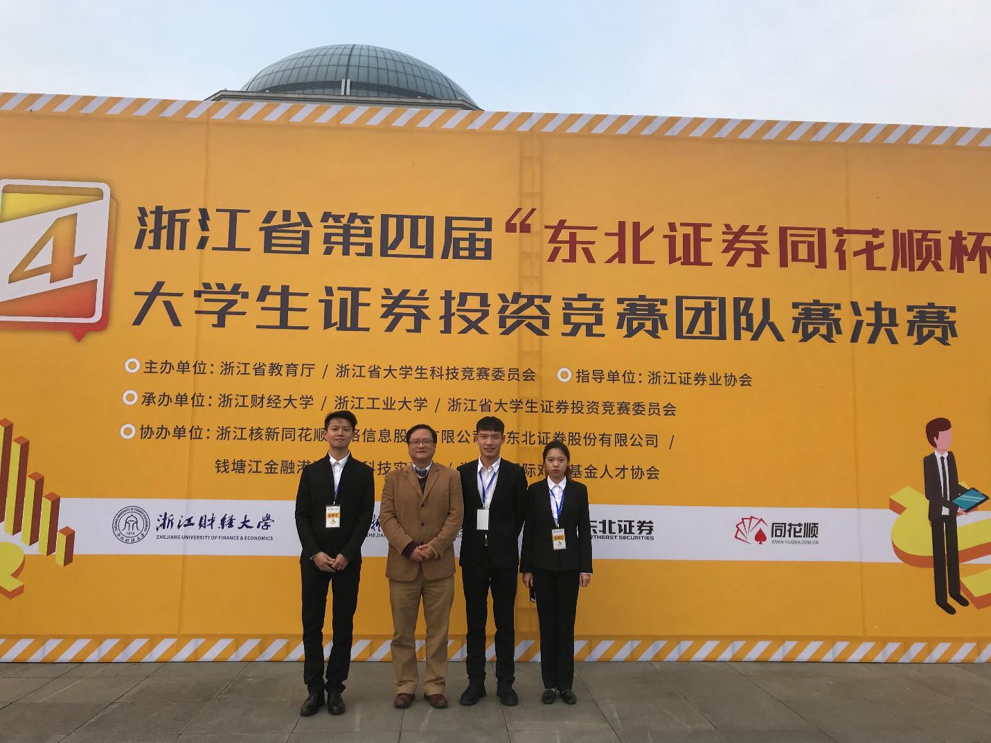 浙江省第四届“东北证券同花顺杯”大学生证券投资竞赛团队赛日前在浙江工业大学屏峰校区举行了决赛答辩后落幕,我校学子再传捷报,由商学院金融学专业的褚圳港、宋墨峰、陈淑姝三位同学组成的理工一队在市场交易组的比赛中,继取得复赛操作全省第二、决赛操作全省第四的优异战绩后,在现场答辩中沉着应对,发挥稳定,最终斩获一等奖,实现我校在这一赛事中的历史突破。