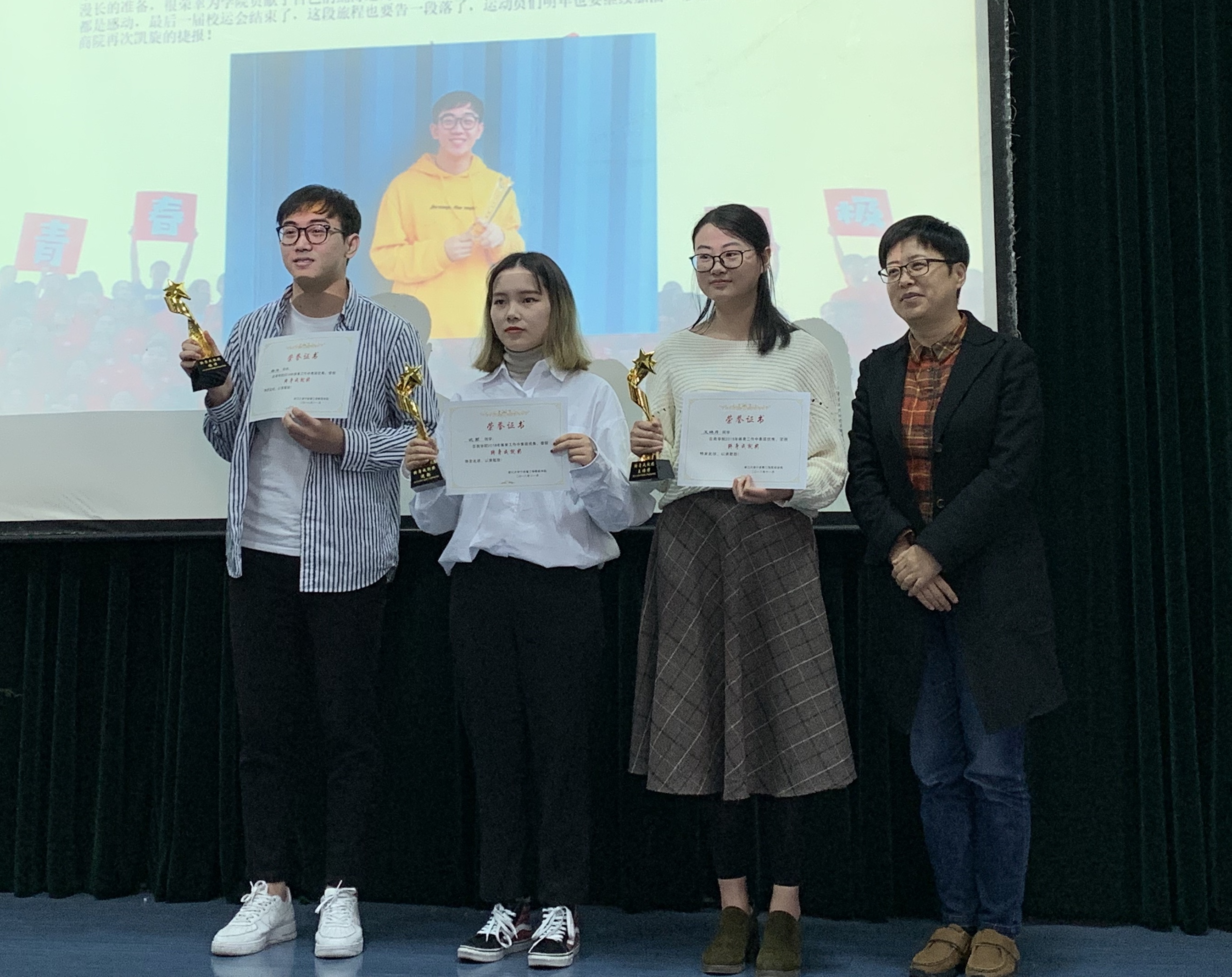 在学风建设中心朱笑燕同学总结过去商学院学风建设的制度与情况之后,金慧燕老师宣读了优良学风班,包静昇老师宣读了“班级发展指数”优良班,陈鑫老师宣读颁发单项奖,以及董俊娜老师宣读颁发了课堂文明个人奖,更有赖寅滨同学的优良学风班经验分享与赵枭宇同学的浅谈班级发展。最后,赵涵老师进行了大会总结并表达了对同学们由衷的感谢与殷殷期望!