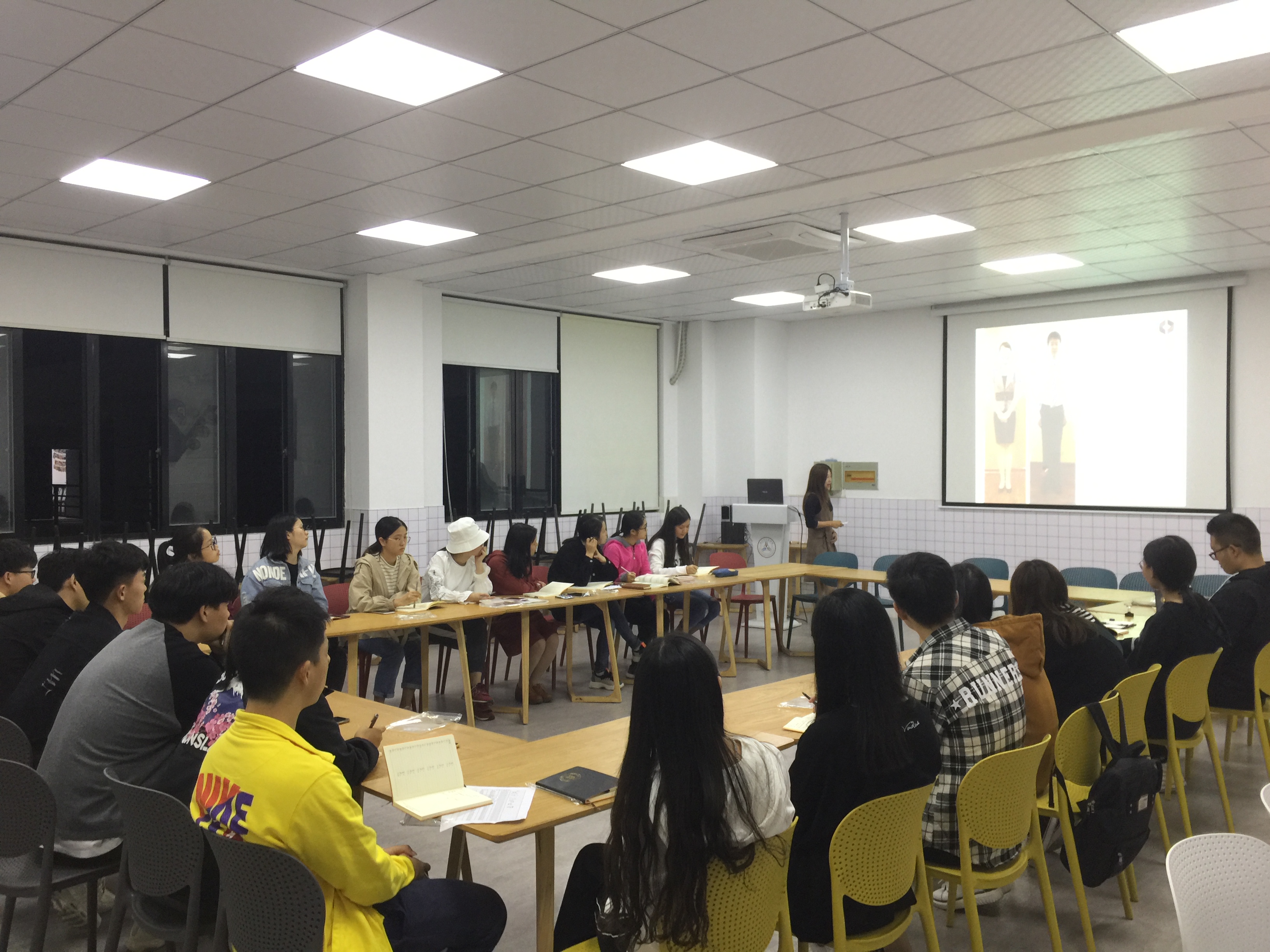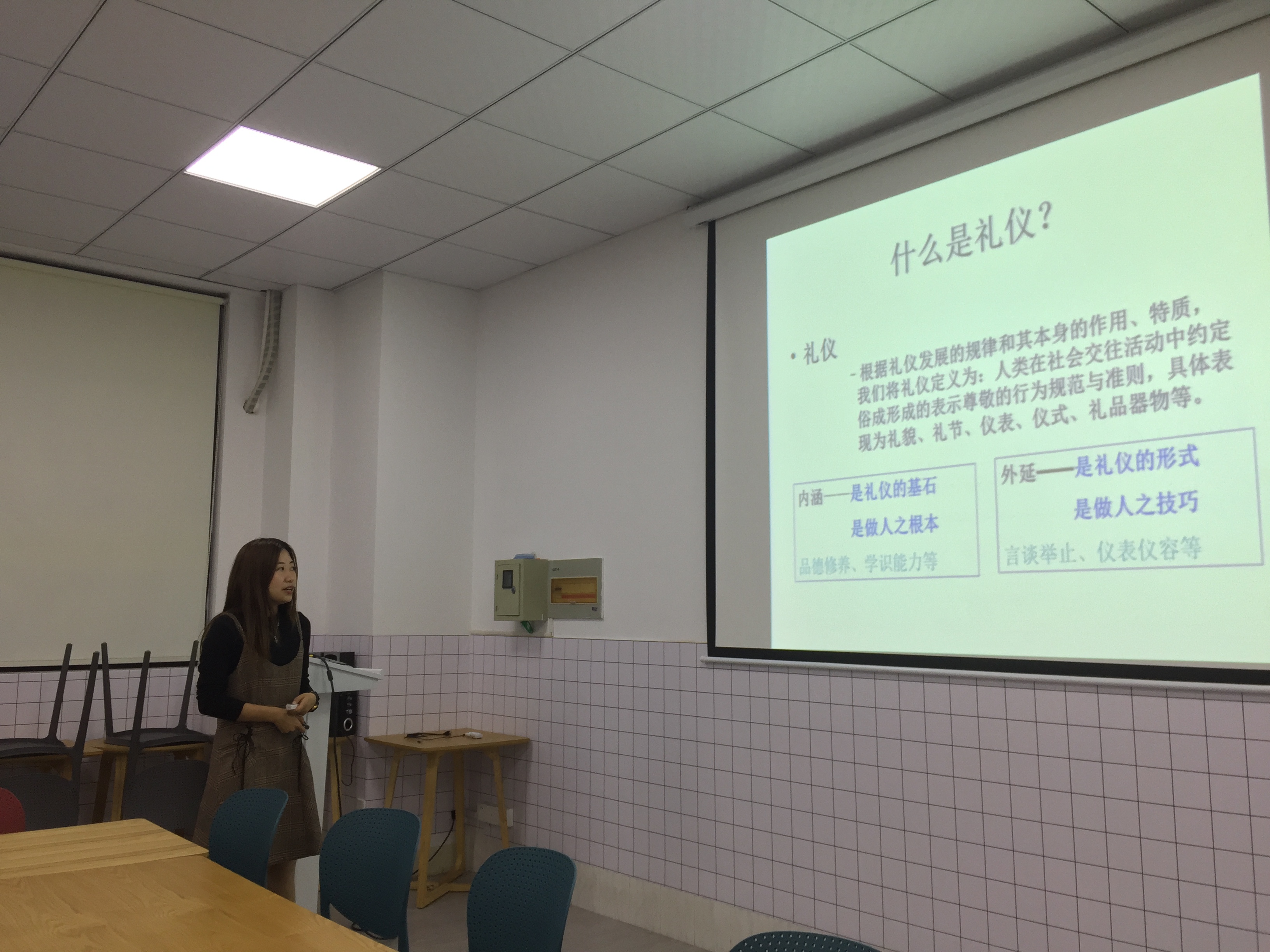 金老师以礼仪的概念切入,强调“微笑从眼神开始”,向学社成员讲解了礼仪的外延——对于我们的外在形象管理和言语间的艺术。金老师用诙谐幽默、层次分明的语言从坐姿规范、站姿规范、行姿规范、演讲常用手势、服饰礼仪、自我介绍、与人沟通、职场面试等方面与大家分享了演讲与礼仪的基本技巧。金老师和同学们还一起进行即兴演讲,在热烈轻松的氛围中,社员们踊跃实践并相互点评。