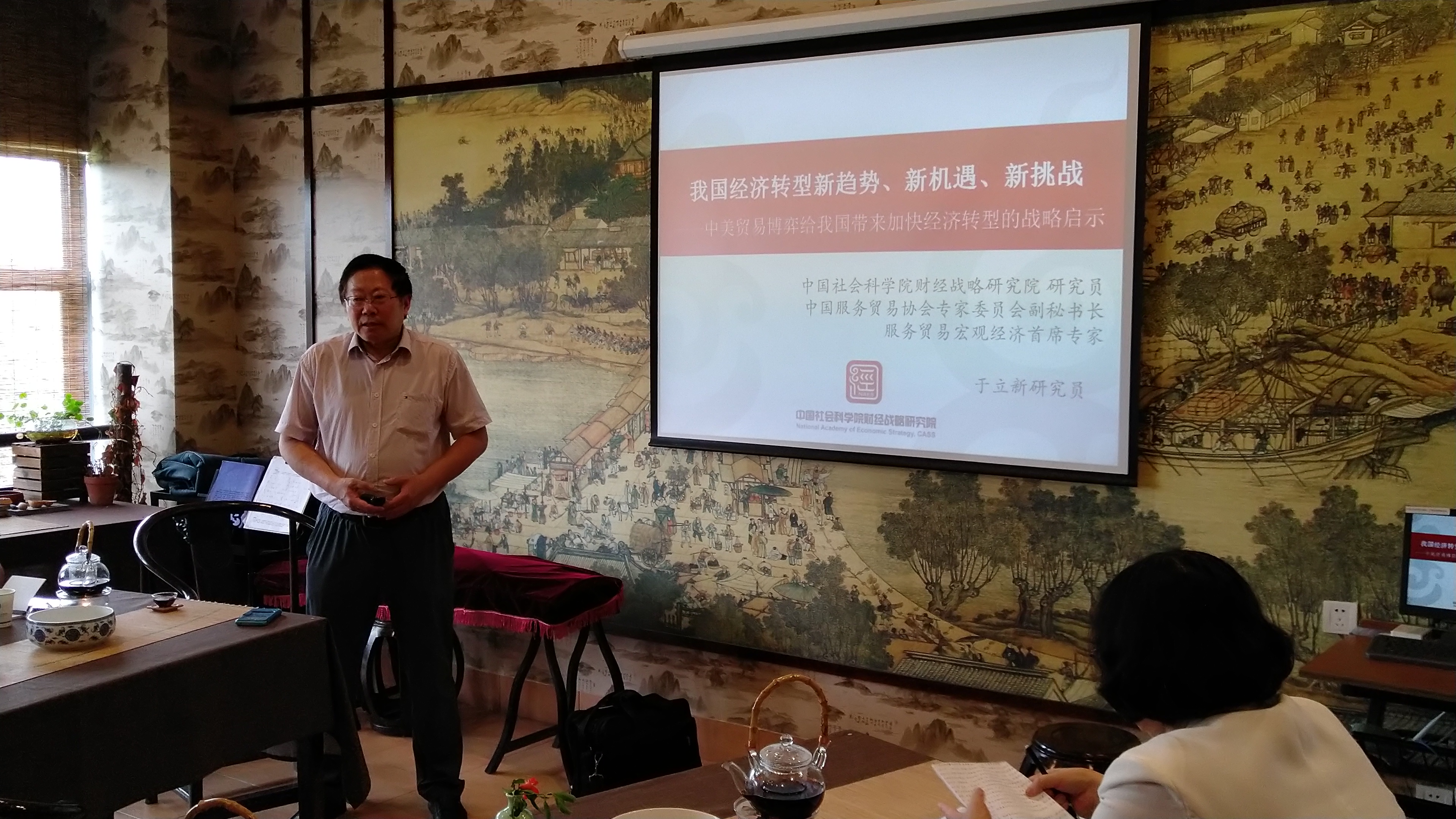 2018年6月13日中午,学院在大益爱心茶室举办了第二十二期学术沙龙,此次沙龙学院邀请了中国服务贸易协会专家委员会副秘书长、中国社会科学院财经战略研究院研究员、中国世界贸易组织研究会理事于立新,为我们带来了《我国经济转型新趋势、新机遇、新挑战—中美贸易博弈给我国带来加快经济转型的战略启示》的主题分享。