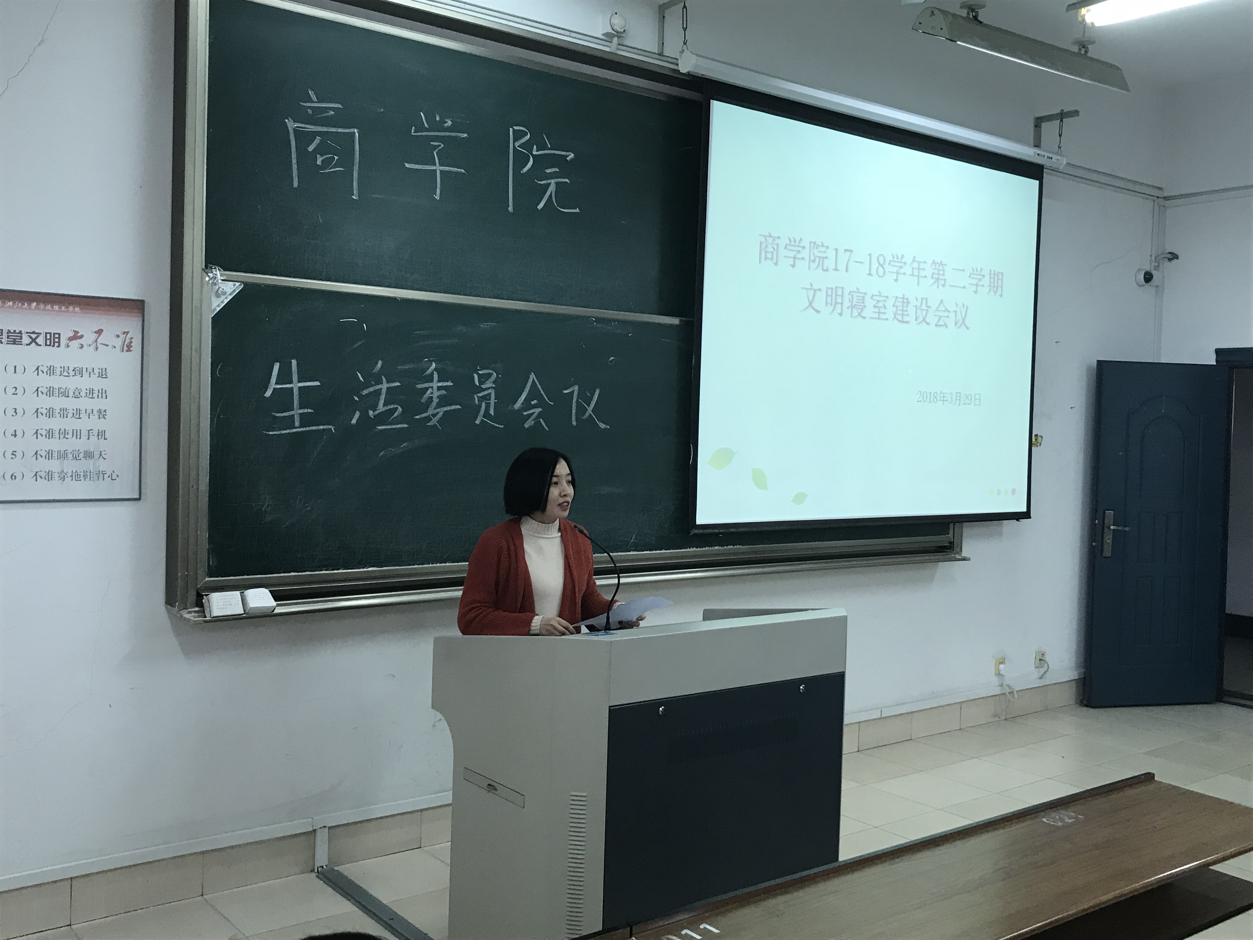 3月29日下午17:10,商学院在SB314召开17-18学年下学期文明寝室建设会议。此次会议由商学院公寓文化建设中心主办,商学院辅导员李慧老师、公寓文化建设中心负责人和各班生活委员参加了此次会议。