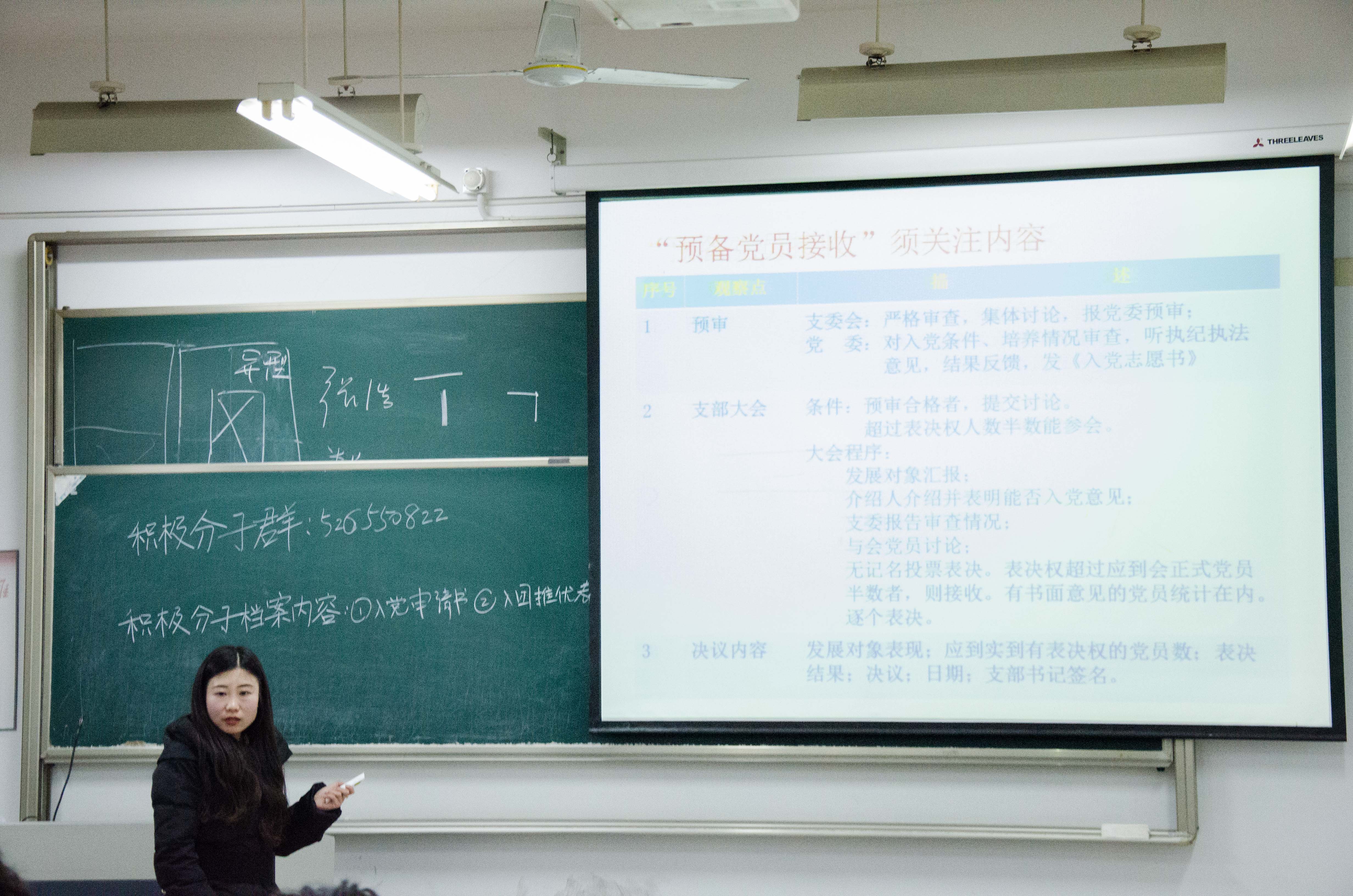 最后,金慧燕老师还强调了“入党积极分子的确定和培养”、“发展对象的确定与考察”、“预备党员接收”等方面党支部新的规范,希望各位积极分子们能够及时规范和完善资料,争取早日入党。