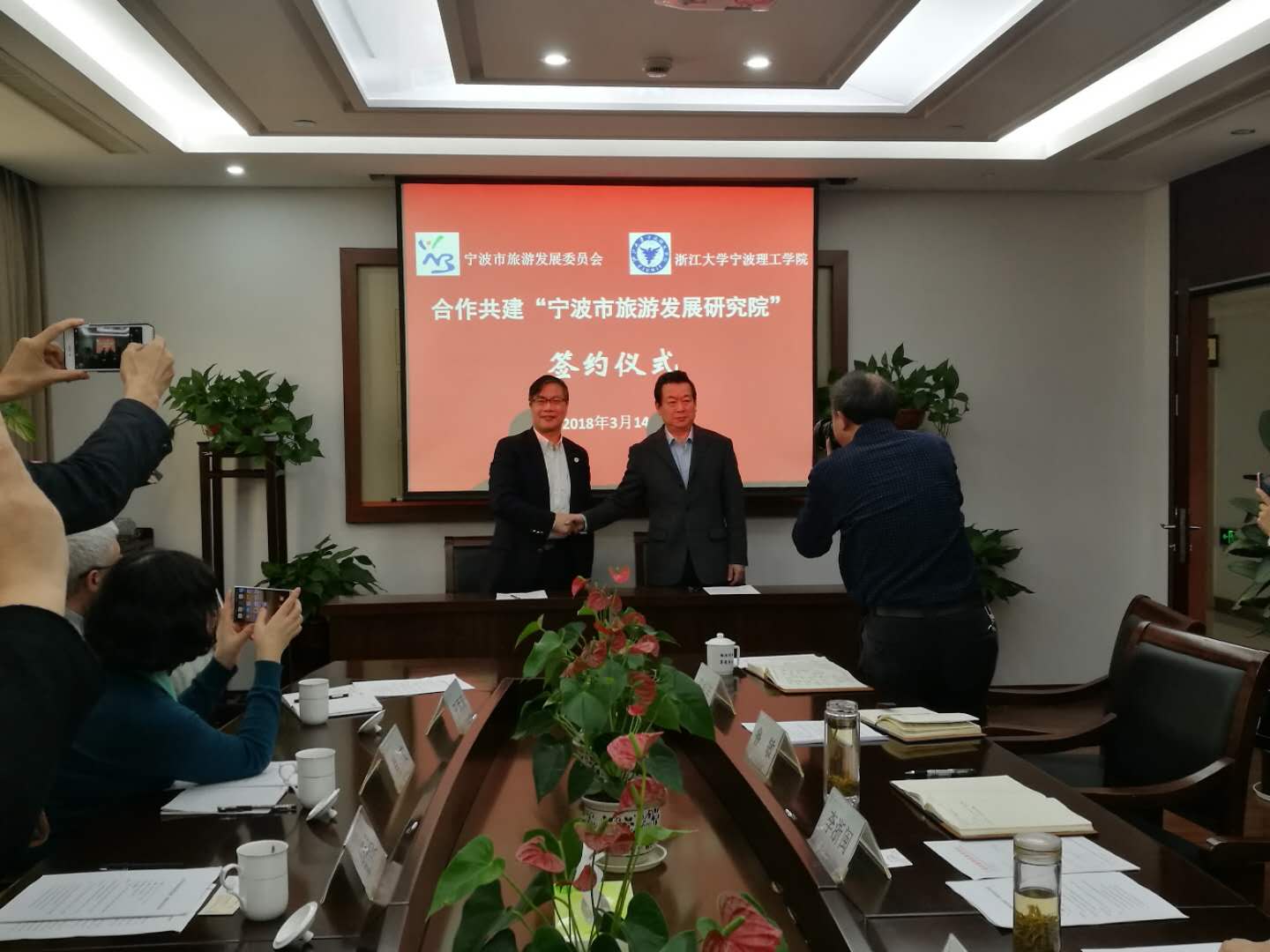 3月14日下午,宁波市旅游发展委员会与浙江大学宁波理工学院正式签约共建宁波市旅游发展研究院。宁波市旅游发展委员会党委书记、局长李浙闽,党委委员、副局长周明力,浙江大学宁波理工学院院长金伟良,浙江大学宁波理工学院副院长杨建刚等领导出席签约仪式。