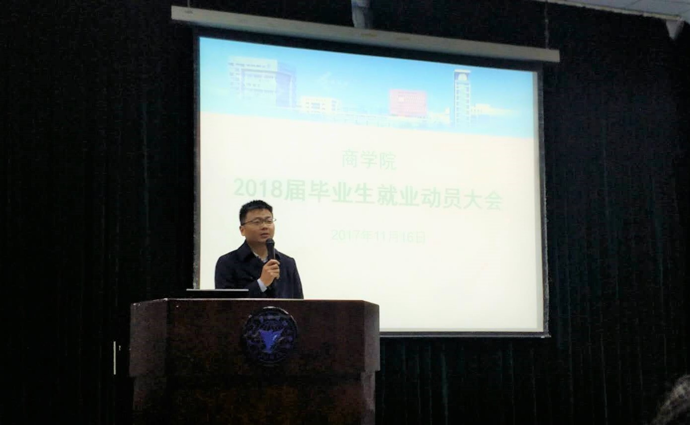 11月21日下午三点十分,外面淅淅沥沥下着小雨,初冬的冷冽不言而喻,NF103会议室门口却热闹地摆着一堆堆的雨伞,室内坐满了认真听讲的同学,这是商学院在召开2018届毕业生就业动员大会。