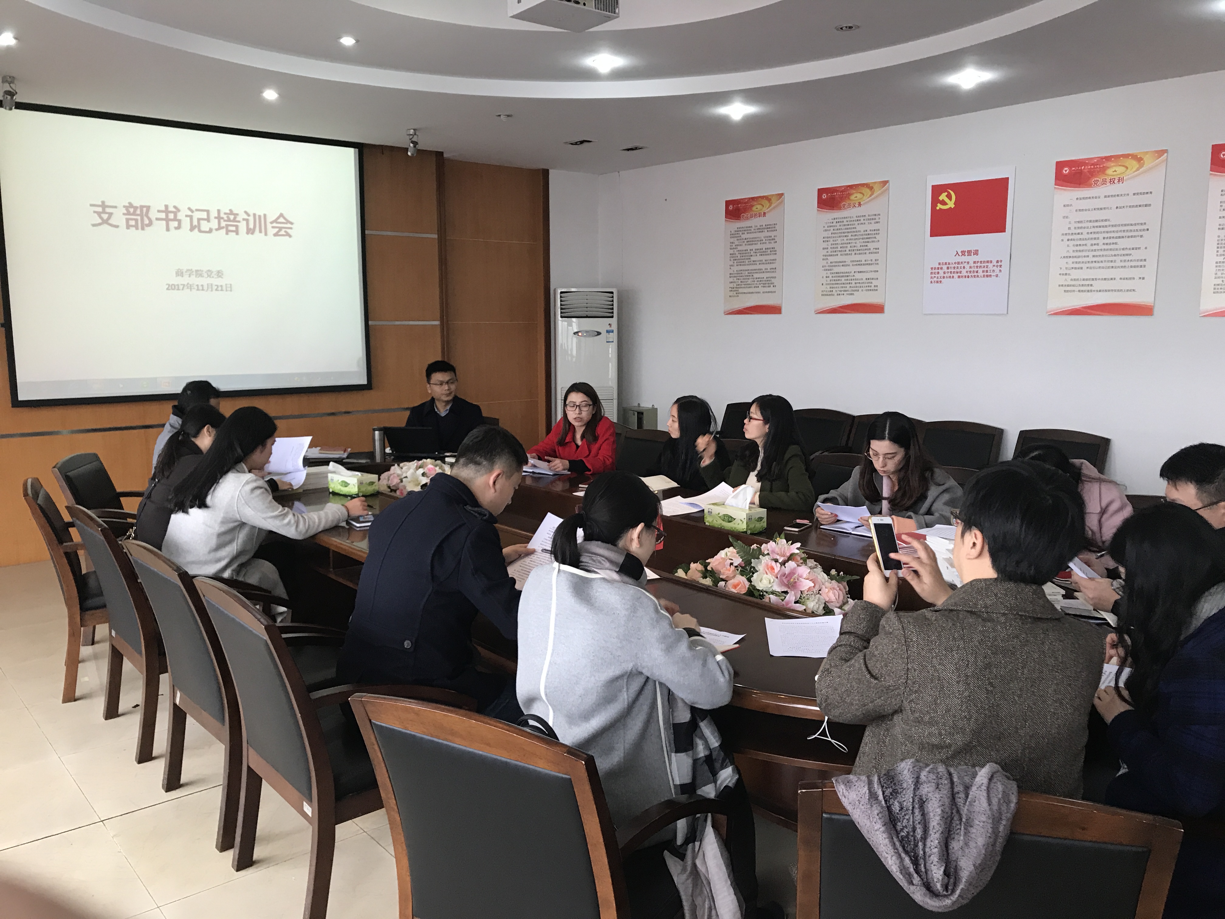 本次培训会首先由柯乐乐老师向各党支部书记下发了全国党员信息系统维护的操作流程并做了答疑。接着是吴新林老师介绍了商学院制定的学习宣传贯彻党的十九大精神的实施方案,随后吴老师就党建工作规范进行了培训,详细解读了教工和学生党支部设置、职责、制度,着重对学生党员发展的整个流程进行了详细的讲解。最后,李萍萍书记在会议上作了总结讲话,她首先对落实学习宣传贯彻党的十九大精神提出了明确的要求,随后反馈了前段时间学校组织的“两学一做”常态化制度化督查工作提出的问题,重点强调党支部工作的规范性和程序性。