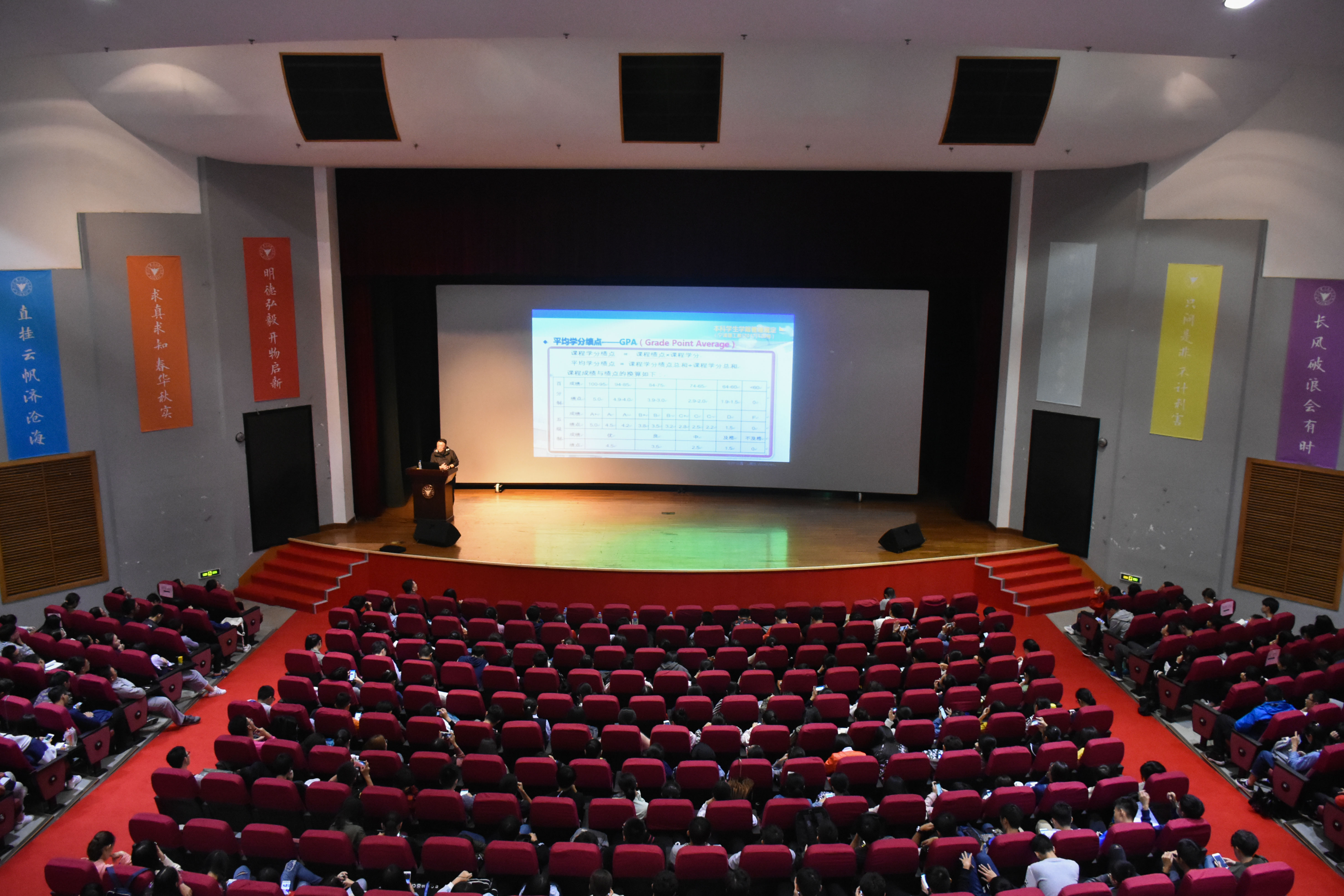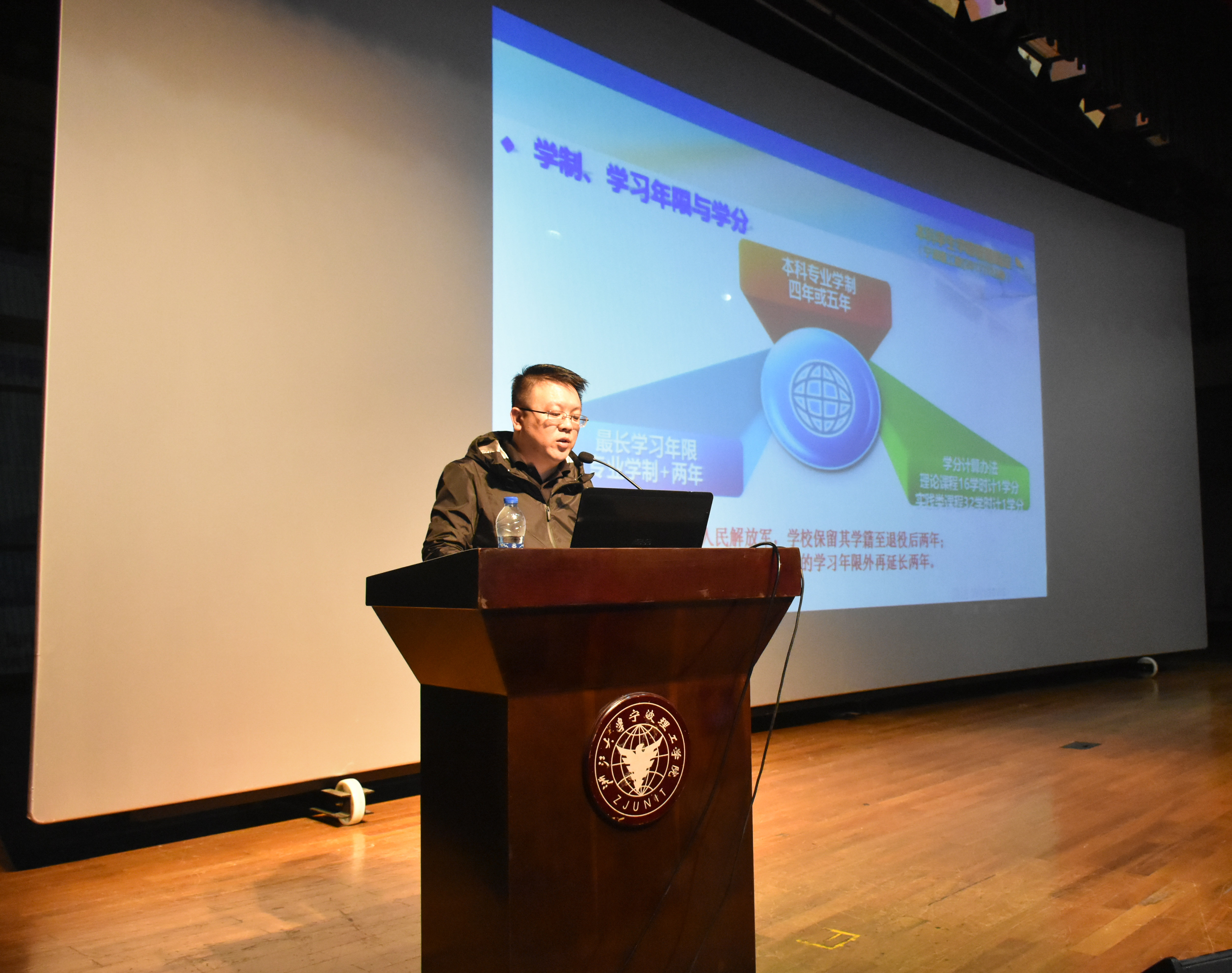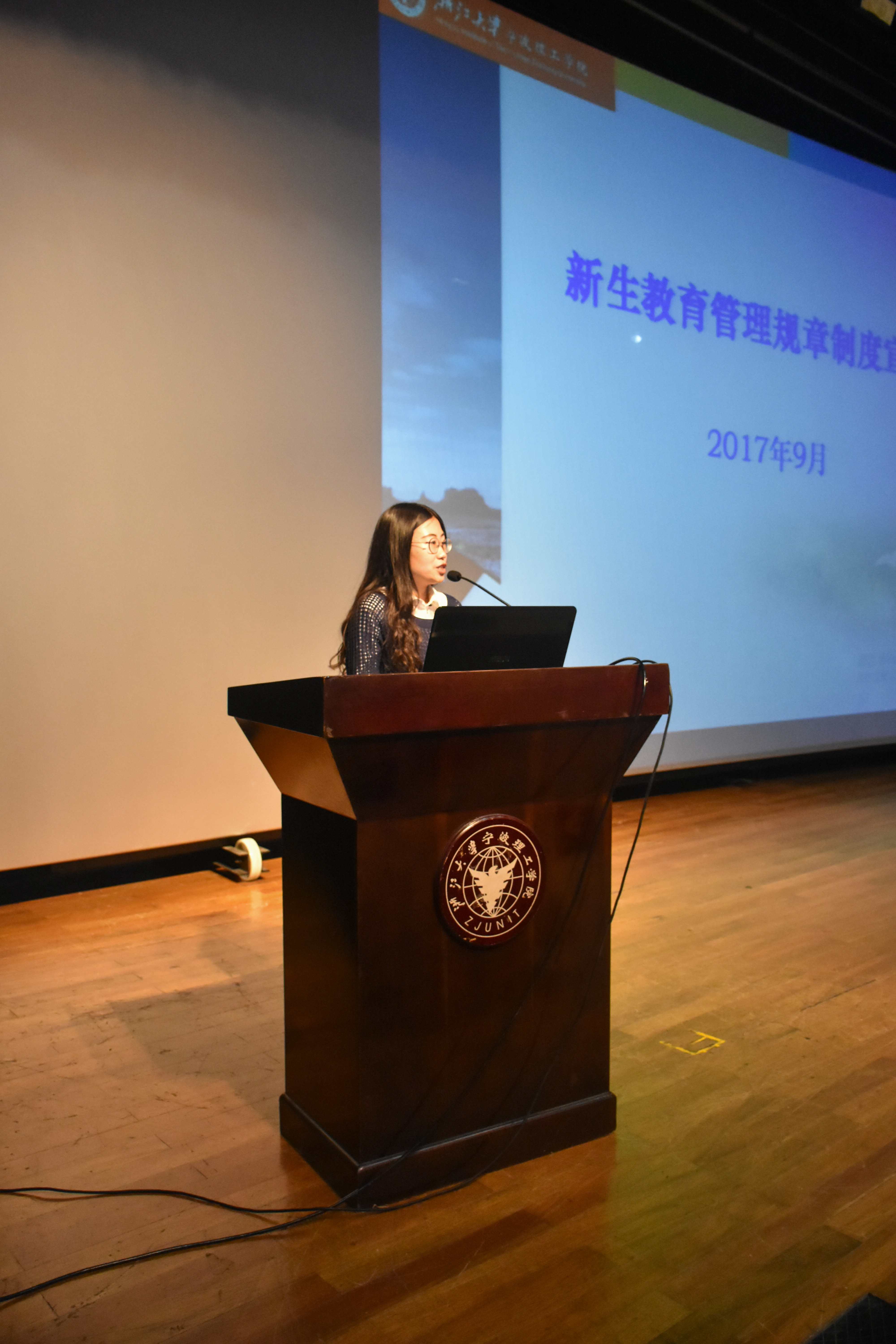 宣讲会上,王一程老师首先给新生们介绍了我校选课制度、学分与绩点、浙大立交桥政策等。他提醒新生每一个学分都是十分重要的,是将来能不能顺利毕业的基础。同时鼓励新生在大学期间不要懈怠,好好学习,积极报考立交桥。金慧燕老师则讲解了学生违纪处分、综合素质测评、评奖评优等相关内容。她表示学院赏罚分明,希望新生遵守规章制度,争优争先。