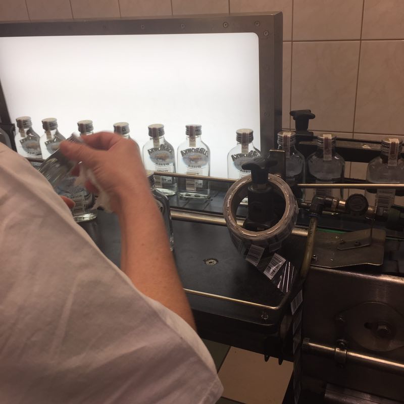 为更好的听取工作人员对生产流程的讲解,我们分成两个小组,先后进去参观。先参观了原材料准备、发酵与混合车间。深井水要先去掉矿物质,并在2天内用掉,或者就要被排除掉,发酵时一定要经历合适的时间,不同口味的伏特加酒添加物也是由公司研发机构不断推陈出新,最后在混合车间混合后就输送入装瓶生产线。