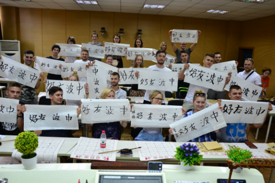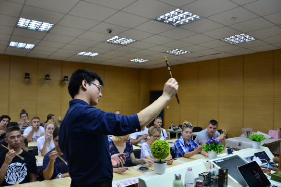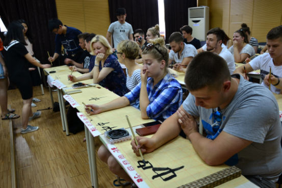 在文化交流日益频繁的今天,越来越多外国留学生对中国的传统文化颇感兴趣。7月10日下午,波兰BUT留学生在我校学习了书法课程。陈鑫老师首先介绍中国书法的历史背景,展示文房四宝,并且以“天”字举例,从甲骨文、隶书到现今的楷书,详细阐述了中国汉字的演变过程。