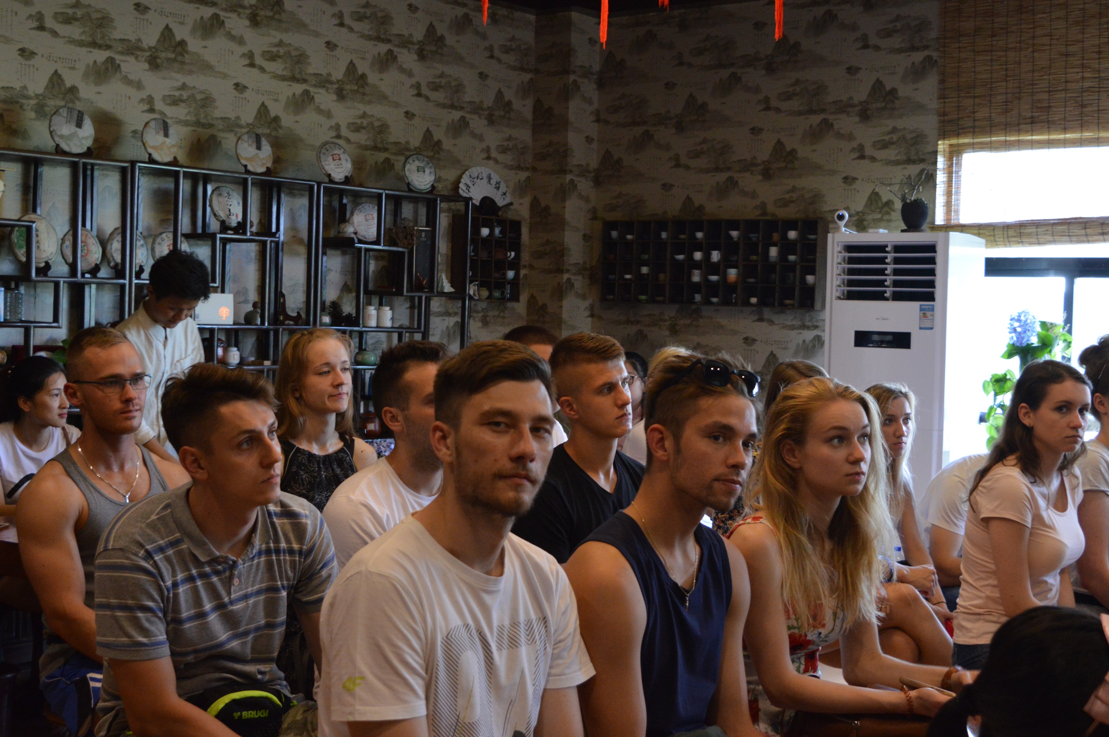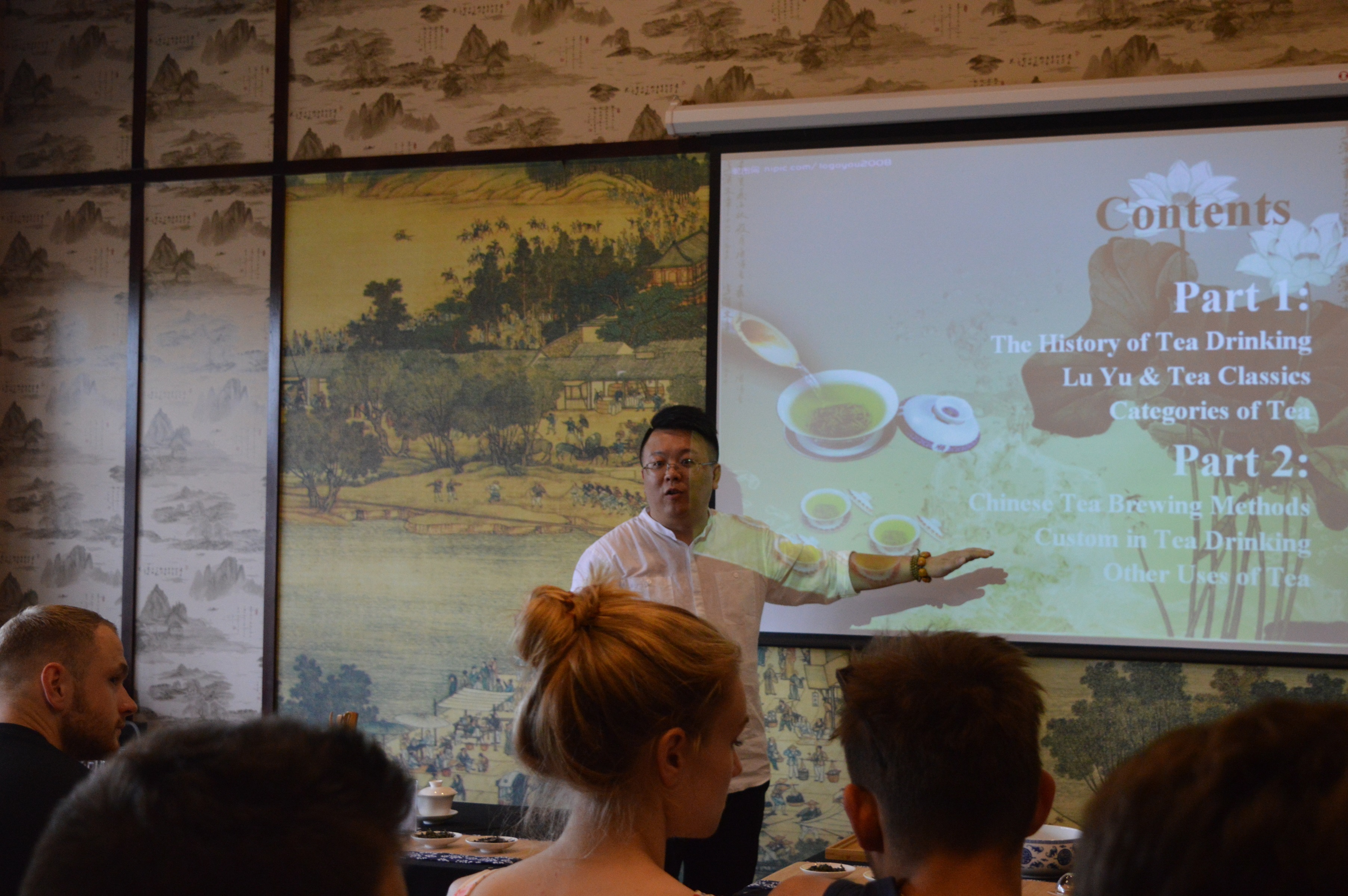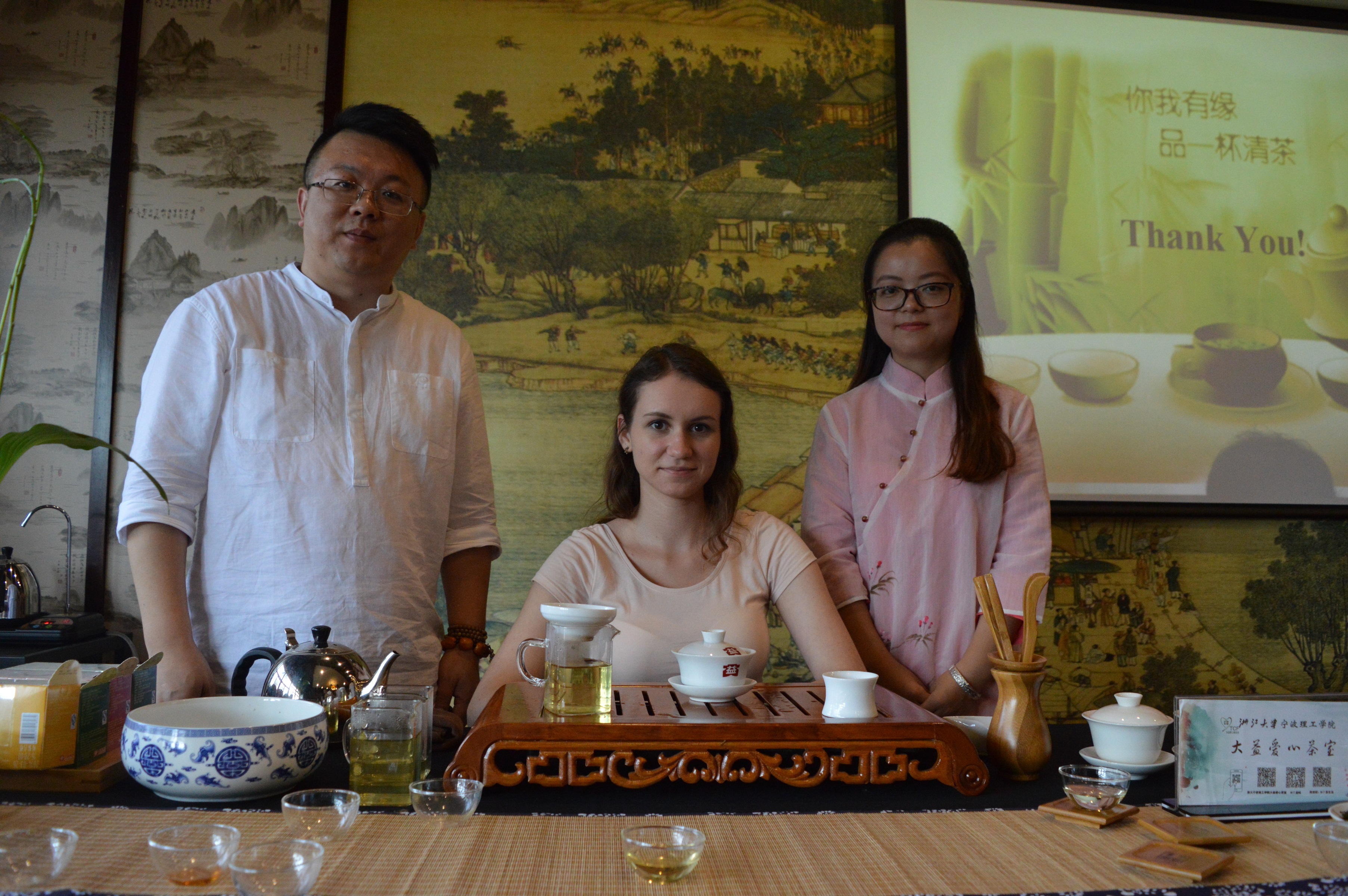 7月6日下午,在SA209大益爱心茶室,商学院王一程老师为我校中东欧物流学院的波兰交换师生们上了一堂生动有趣的中国茶文化课。课程包括理论介绍和实际操作两部分,王老师通过引入神农尝百草以茶解百毒的故事,首先介绍了中国茶文化的起源、分类、功效以及茶文化传统等,并专门介绍了波兰茶产品进口及其与中国茶产品人均消费量的对比情况。在实操环节,两位商学院大三的同学在高山流水的音乐下,进行了茶艺表演,展示了泡功夫茶的高超技艺,温壶温杯、清洗杯具、凤凰三点头......同学们如行云流水般、温婉大方的茶艺表演,赢得了波兰师生的阵阵惊叹!