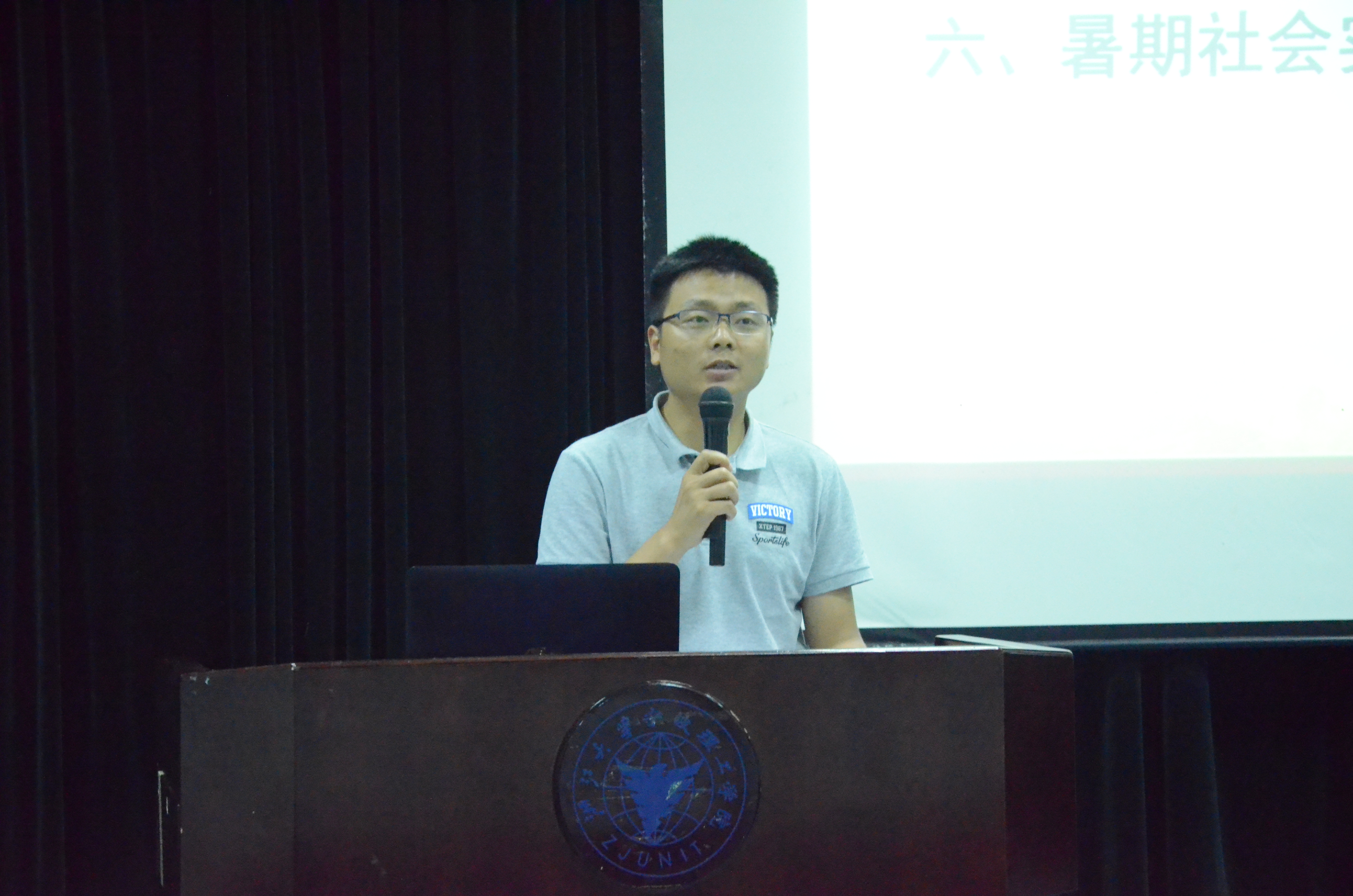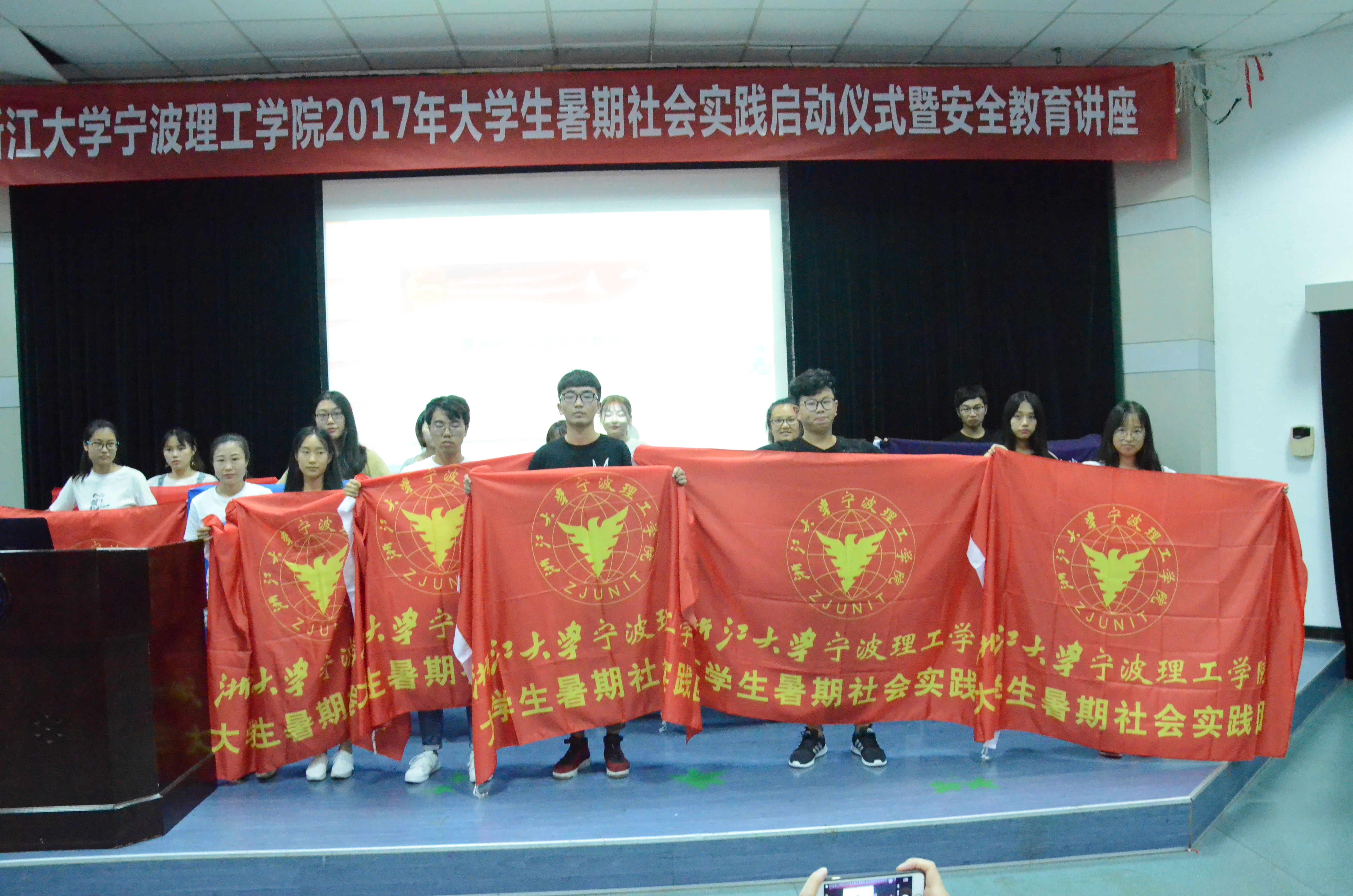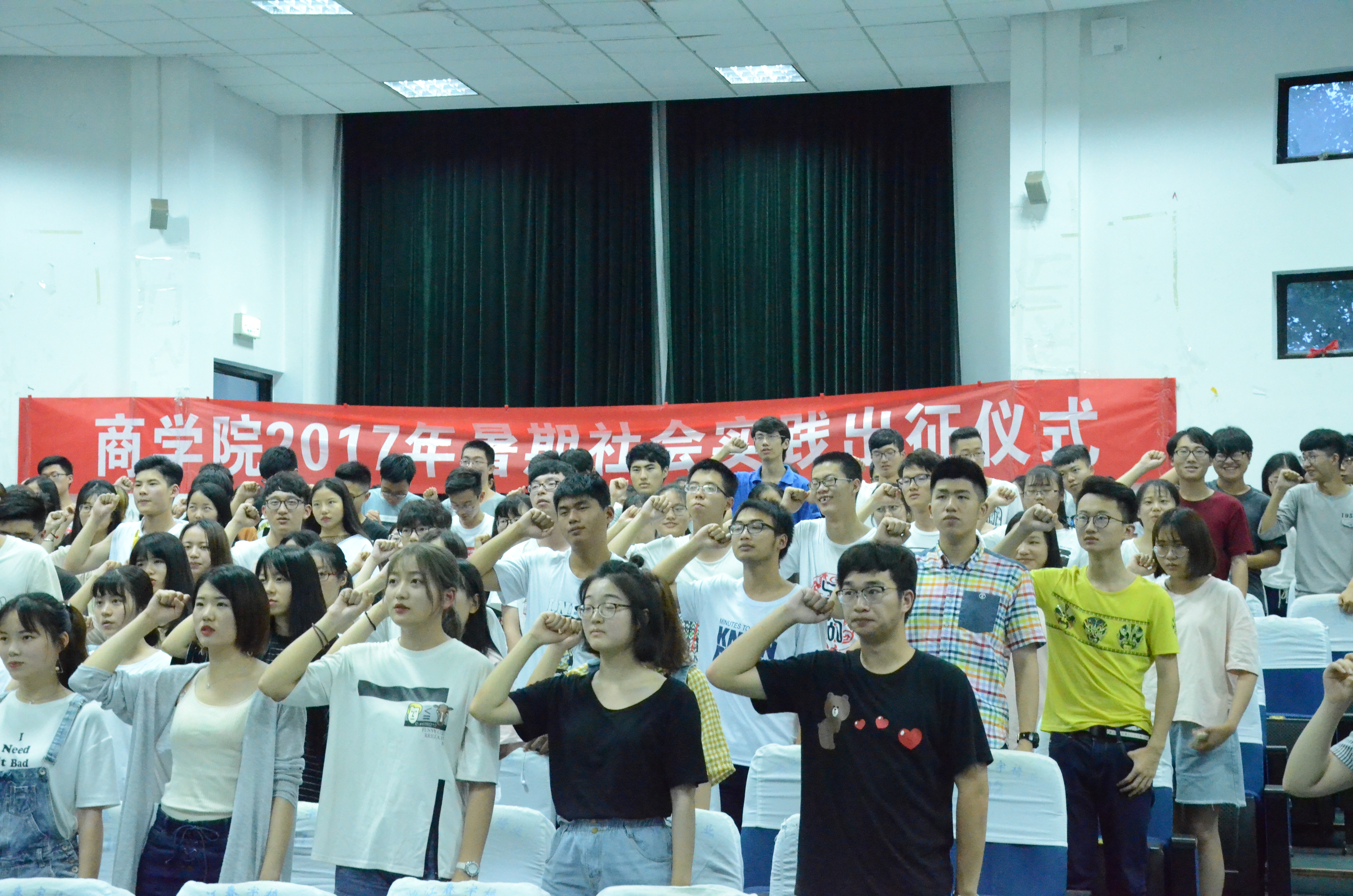 仪式开始,在主持人介绍与会人员之后,全体起立,奏唱庄严的国歌。紧接着,由马双龙老师介绍学院2017年暑期社会实践立项情况和总体安排,指出此次商学院的社会实践是理工有史以来规模最大的一次,希望所有活动能有条不紊的进行。之后,“青春的名义”赴四明山团队队长边凌杰作为出征队伍代表发表讲话并宣读倡议书,希望所有队伍都能取得成效,但同时也要遵守纪律,注意安全。随后举行出征授旗仪式,由金慧燕老师为重点团队的15名队长授旗并进行合影。接下来,吴新林老师发表了暑期社会实践安全教育讲话,他对同学们提出了几点要求,希望同学们尊重当地习俗,相关法规;注意吃穿住行,保障人身安全;宣扬理工人、商院人的优良精神等。能在遇到突发状况时,及时与其他人取得联系并与指导老师进行沟通。最后,由林振威同学带领各实践队成员宣誓,充分表现出了此次实践队员们的信心。