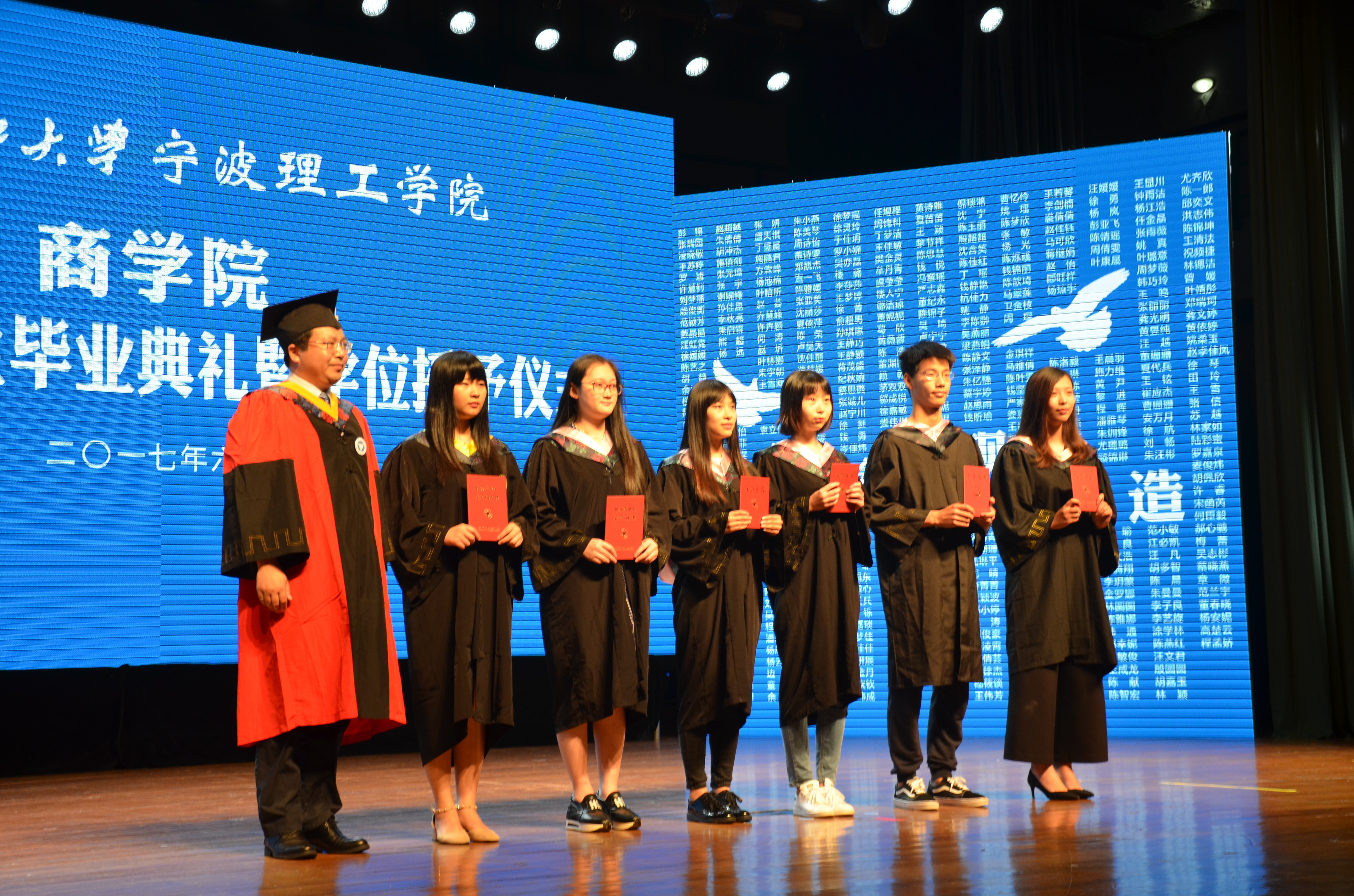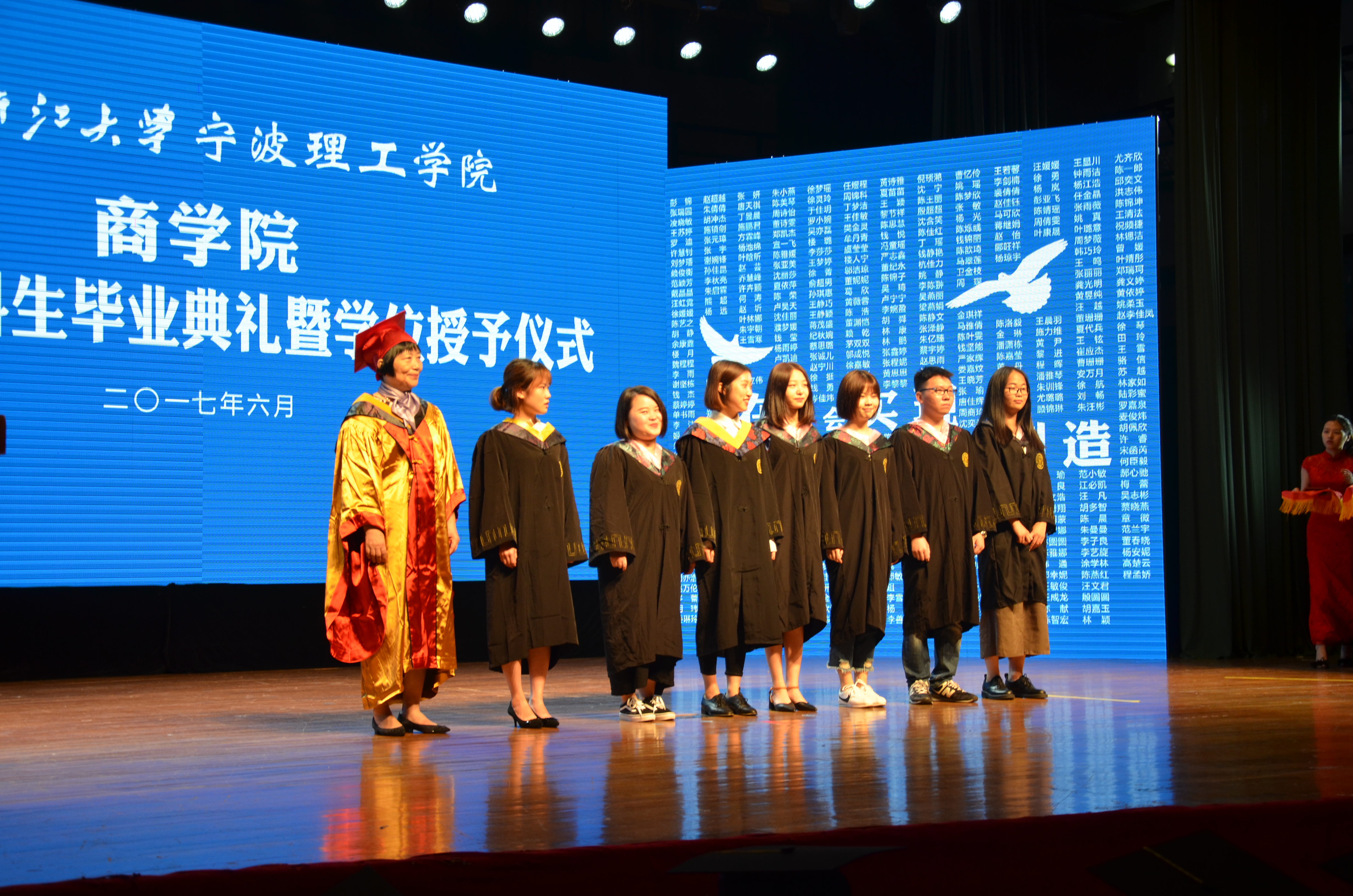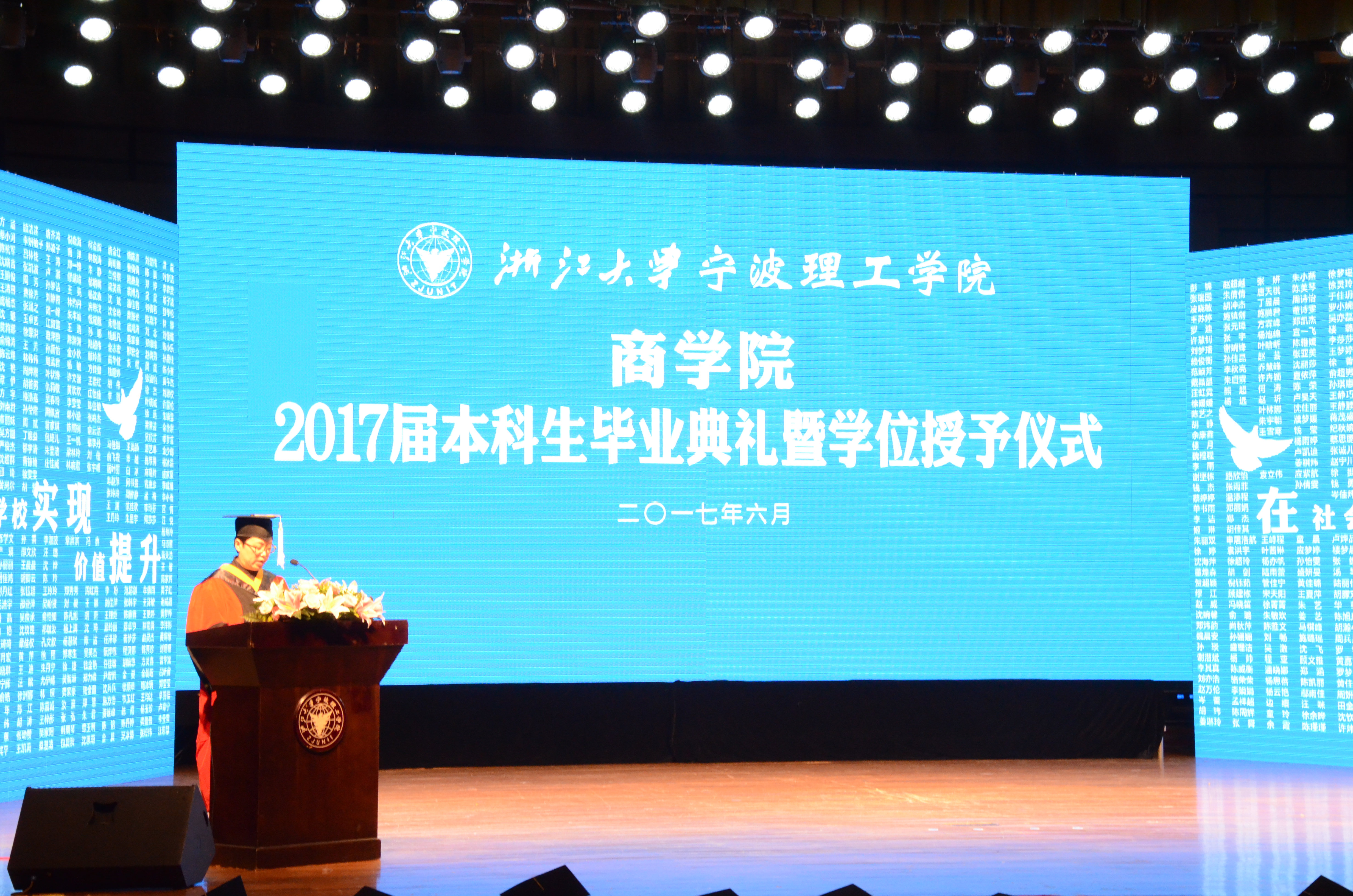 6月18日上午8点,浙江大学宁波理工学院商学院2017届本科生毕业典礼暨学士学位授予仪式在可珍讲堂隆重举行。校党委副书记黄光杰,商学院院长肖文、党委书记李萍萍、常务副院长林承亮等商学院全体班子成员,以及学院专业教师代表、毕业班班导师、毕业生家长代表出席了毕业典礼,仪式由李萍萍书记主持。