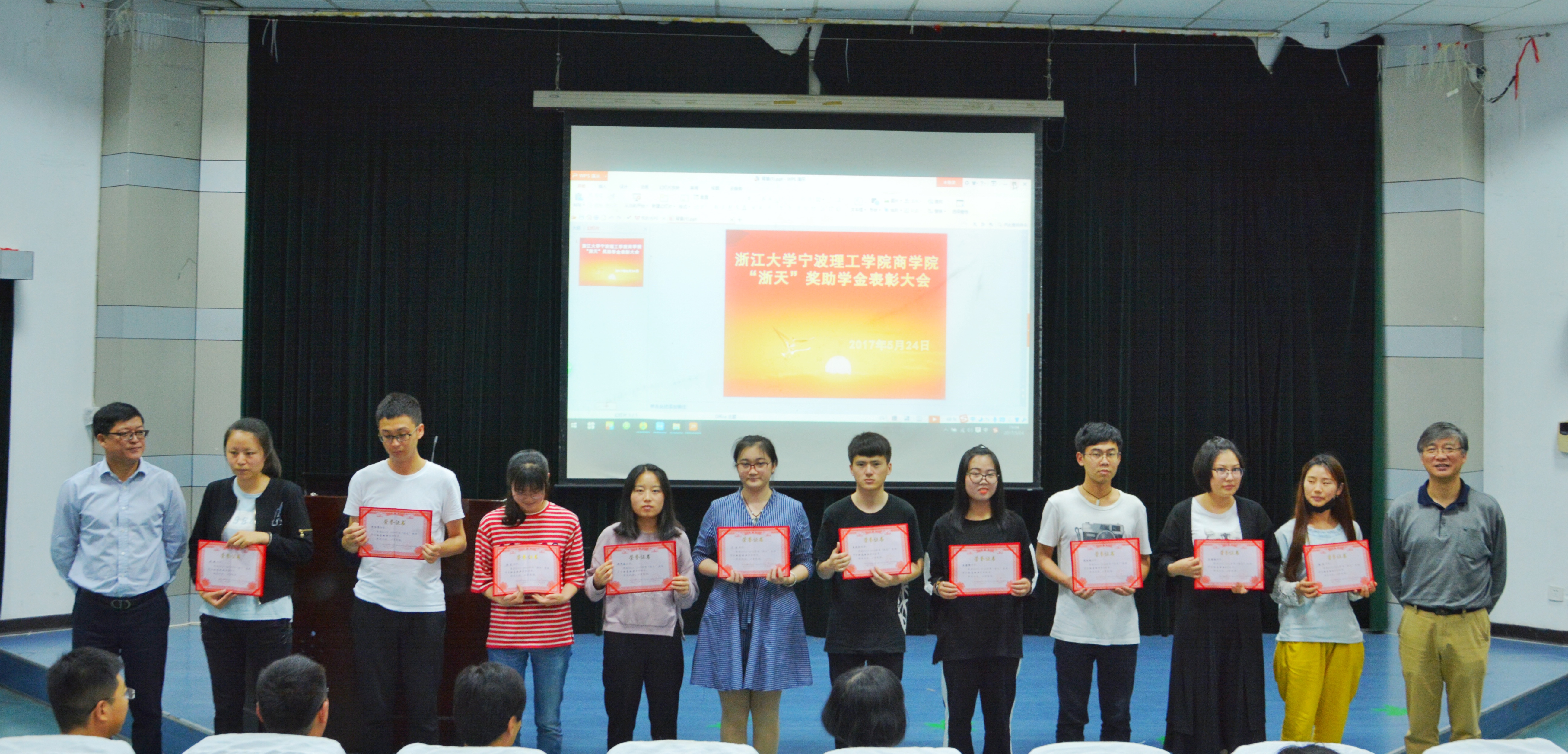 精彩的讲话后,商学院党委书记李萍萍老师宣读15-16学年“浙天”奖助学金十佳学生、励志标兵、学术标兵、公益使者、文体之星、先进集体获奖名单并由与会领导和来宾为获奖学生和集体代表颁奖。获奖学生代表郭先铖同学在发言中希望广大优秀的同学都能积极争取浙天奖学金,不忘初心,奋力前行。接下来各类奖项获奖代表的汇报展示也各具特色。十佳学生代表沈颖提出,要发掘兴趣爱好,有计划有目标的做事;学术标兵代表林家阳认为理论知识和课外实践都是十分重要的,做事要注重团队协作;励志标兵代表章晓丹表示,我们的精神一定要始终健康;公益使者代表慎麒提倡我们要心怀善念,做一个合理幸福的青年;文体之星代表周翊晨告诉我们大目标会让困难自然而然变小。先进集体代表范潇逸用寝室成员的优异表现展示了寝室氛围对个人成长的重要性。