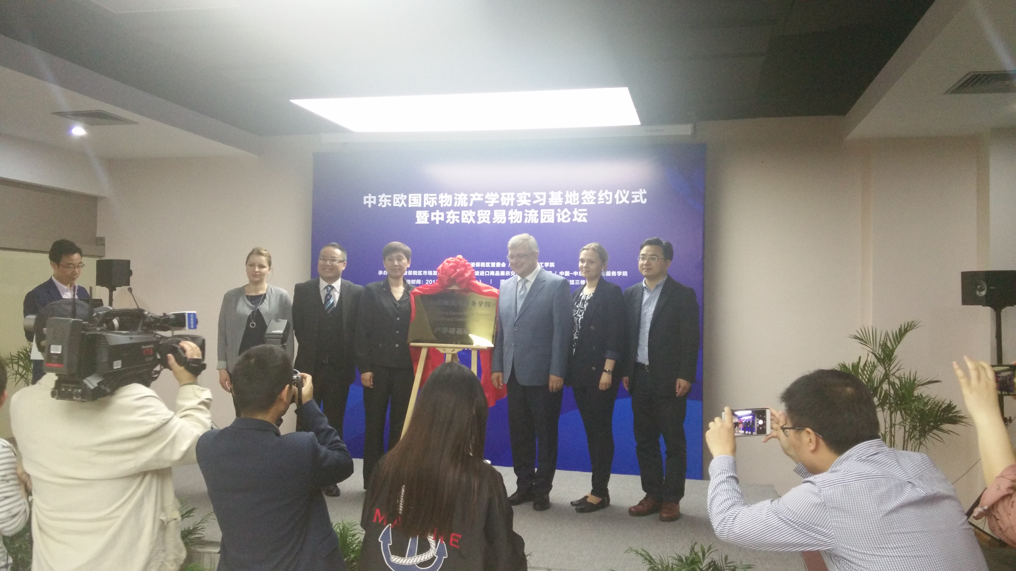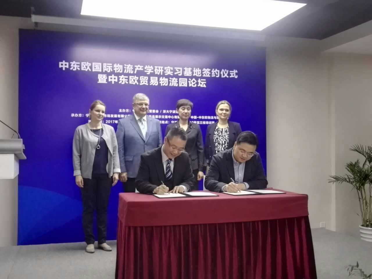 在与会中外嘉宾的共同见证下,中国-中东欧物流学院中方院长汪浩教授与宁波进口商品中心总经理汪涛先生共同签订了共建合作协议。同时,夏群女士与Nazarko教授为“中国-中东欧物流与服务学院产学研基地”共同揭牌。