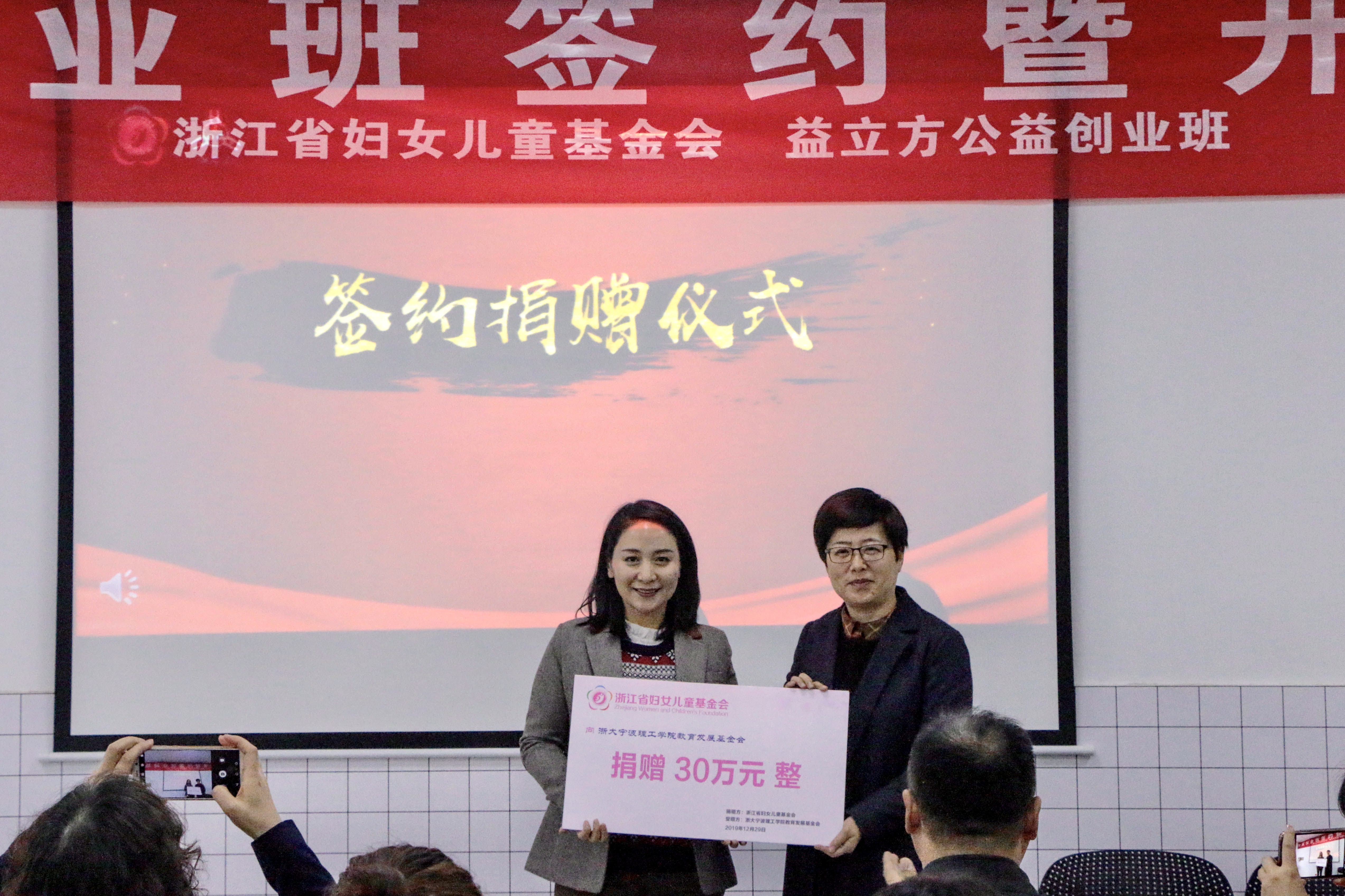 本次仪式上,浙江省妇女儿童基金会与浙江大学宁波理工学院益立方公益学院签署了战略合作协议,并向益立方公益学院捐赠人民币30万元的爱心基金资助公益创业事业的发展,同时浙江省妇女儿童基金会副理事长邱哲女士受聘为商学院兼职教授。与会嘉宾为第四期公益创业班学员颁发了录取证书。