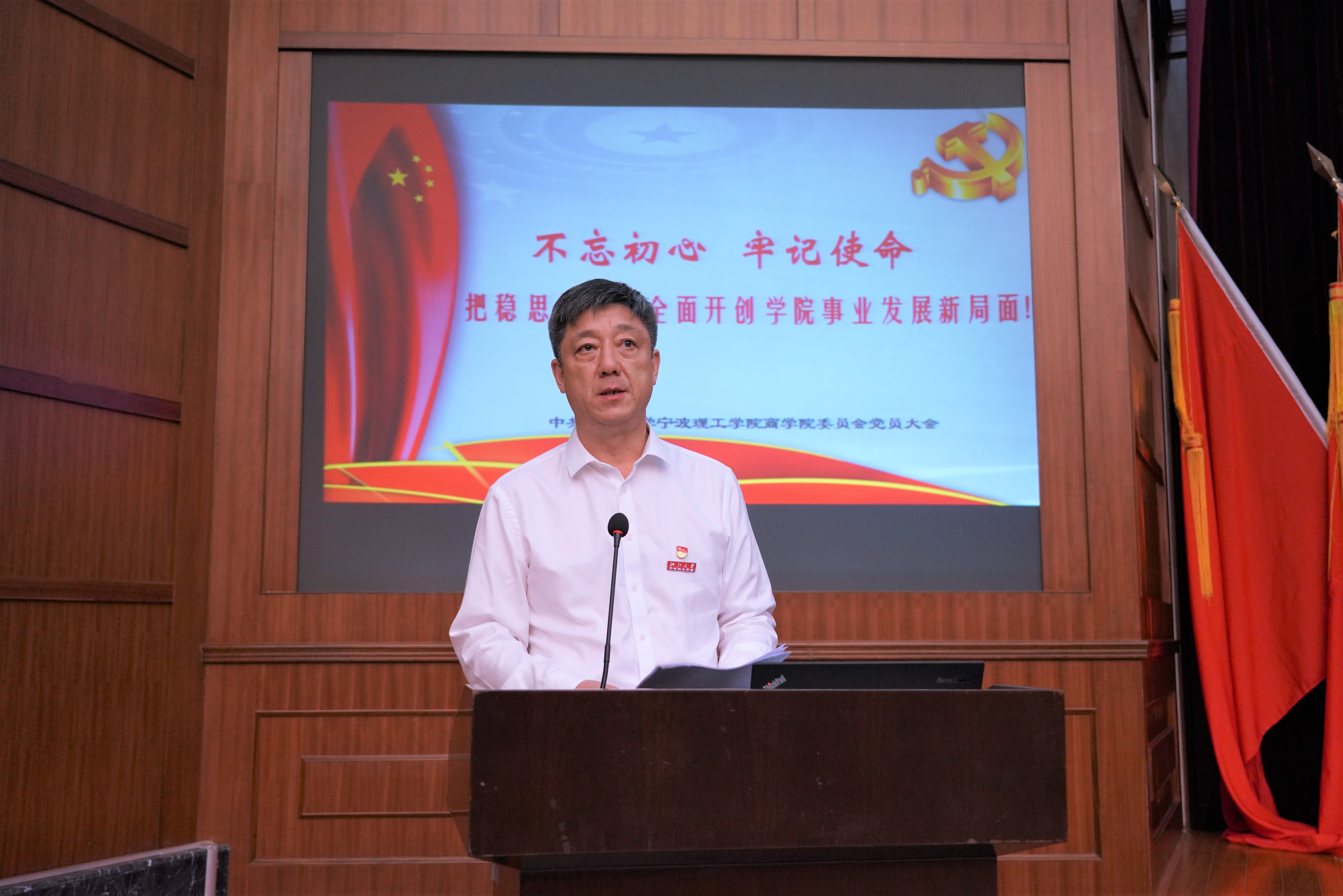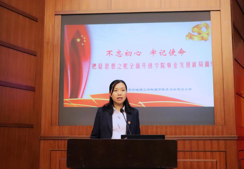 随后,学院党委书记、副院长李萍萍代表学院党委作《不忘初心 牢记使命 把稳思想之舵全面开创学院事业发展新局面》的工作报告。报告回顾了商学院党委成立以来的工作,分析了当前学院发展面临的困难和挑战,提出了新形势学院发展的基本思路和主要举措。报告指出,要坚持思想引领、制度先行,以学院设系为契机,不忘初心,牢记使命,紧紧围绕人才培养这一中心工作改革创新、团结奋进,为建设与国际接轨的区域一流商学院努力奋斗!