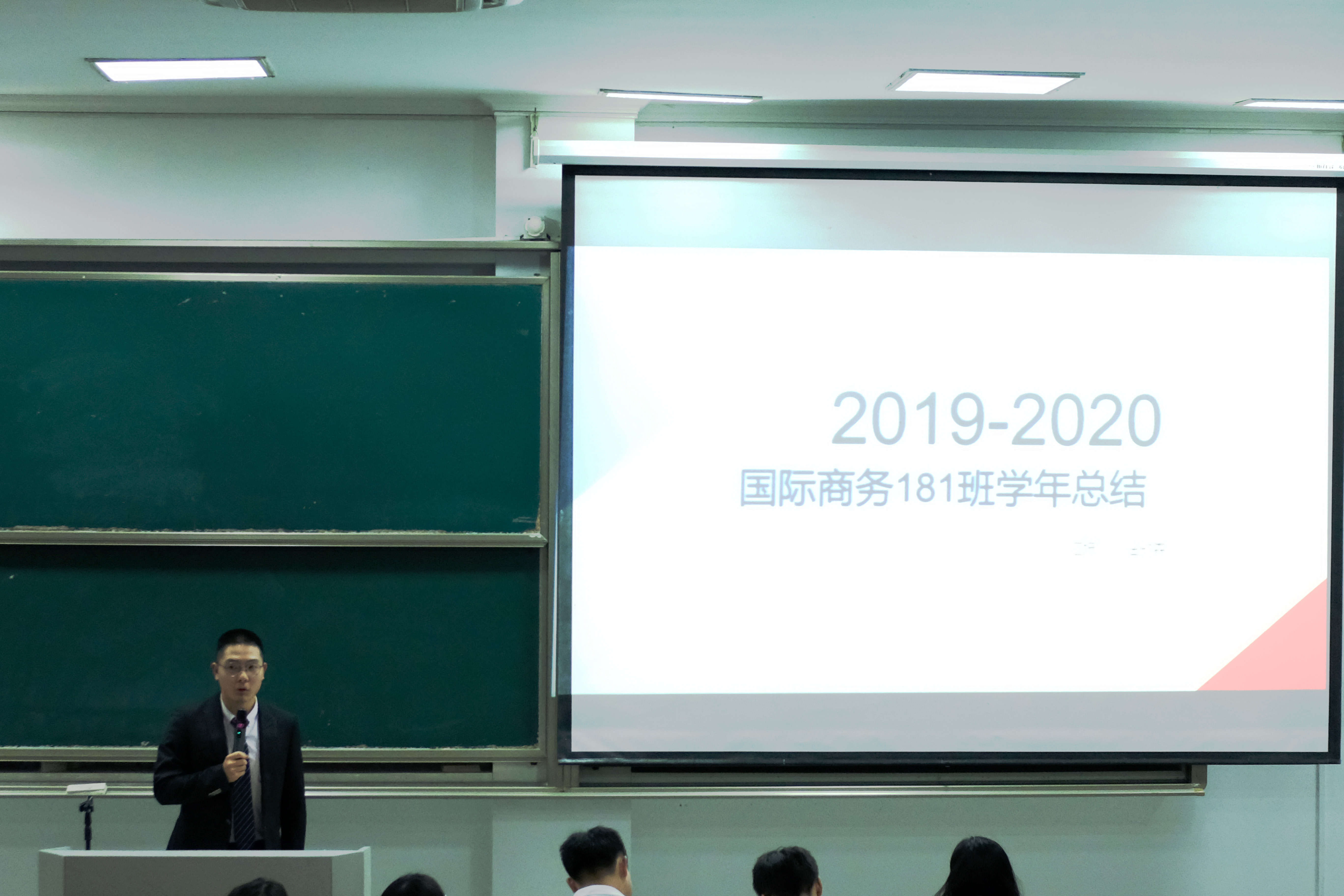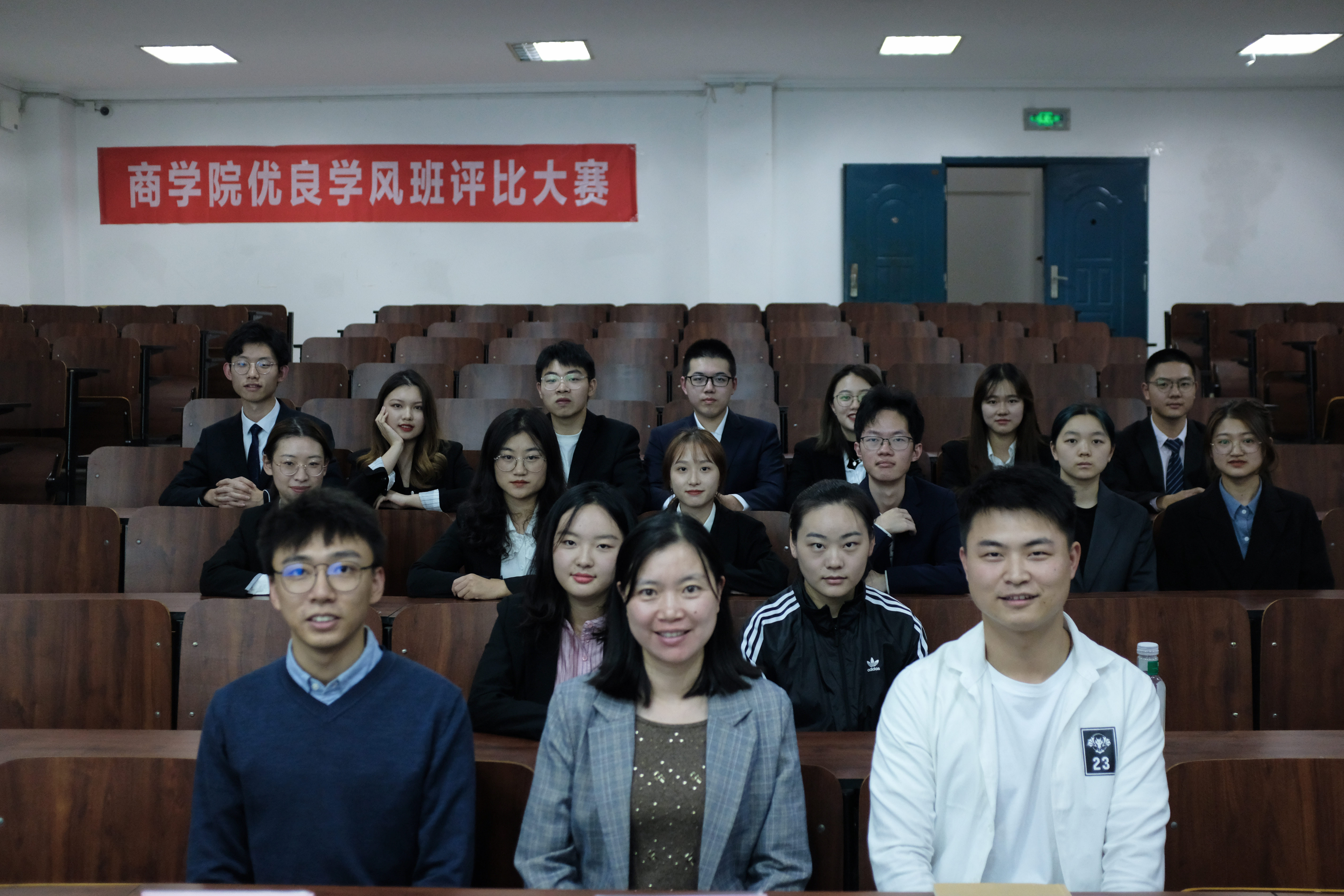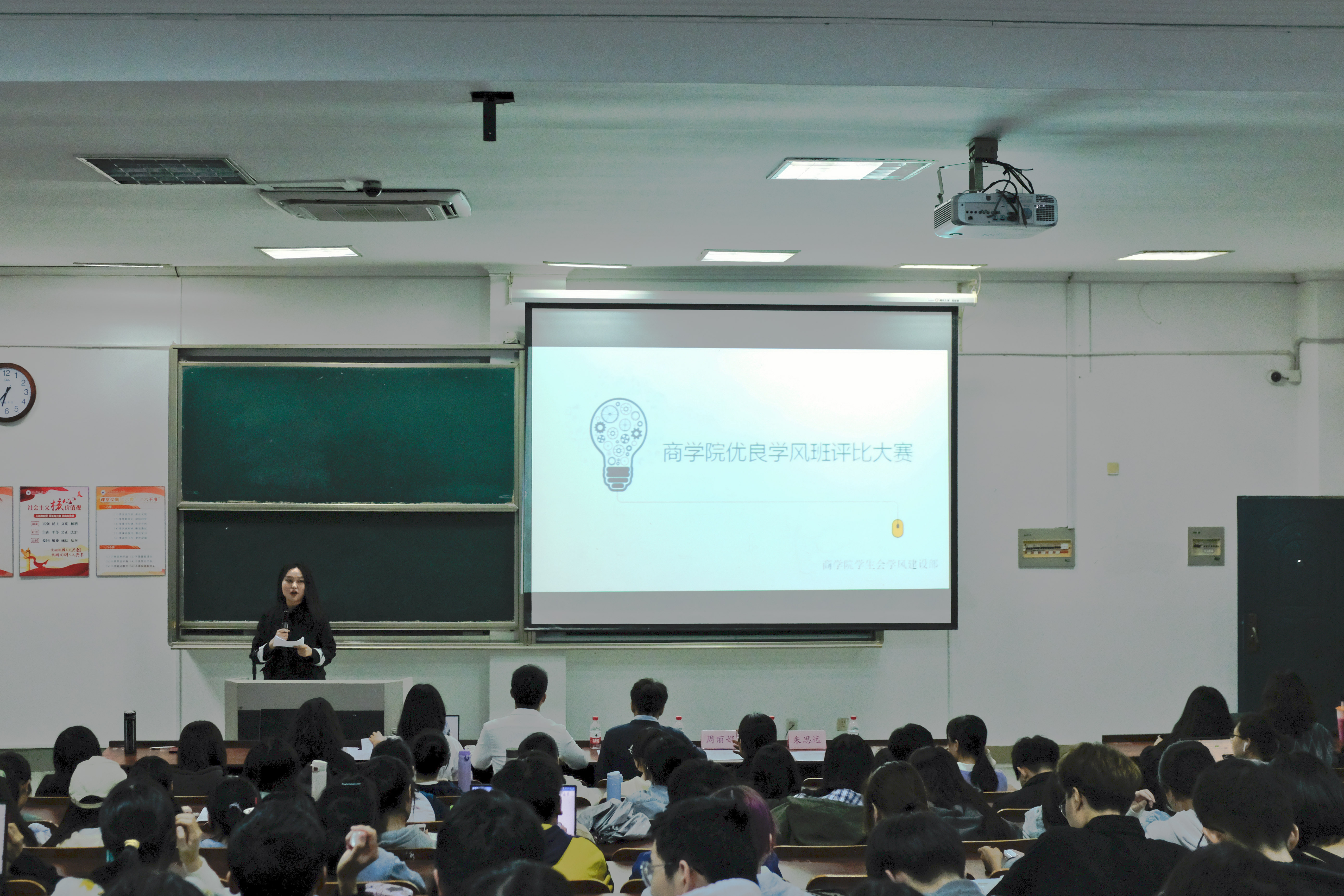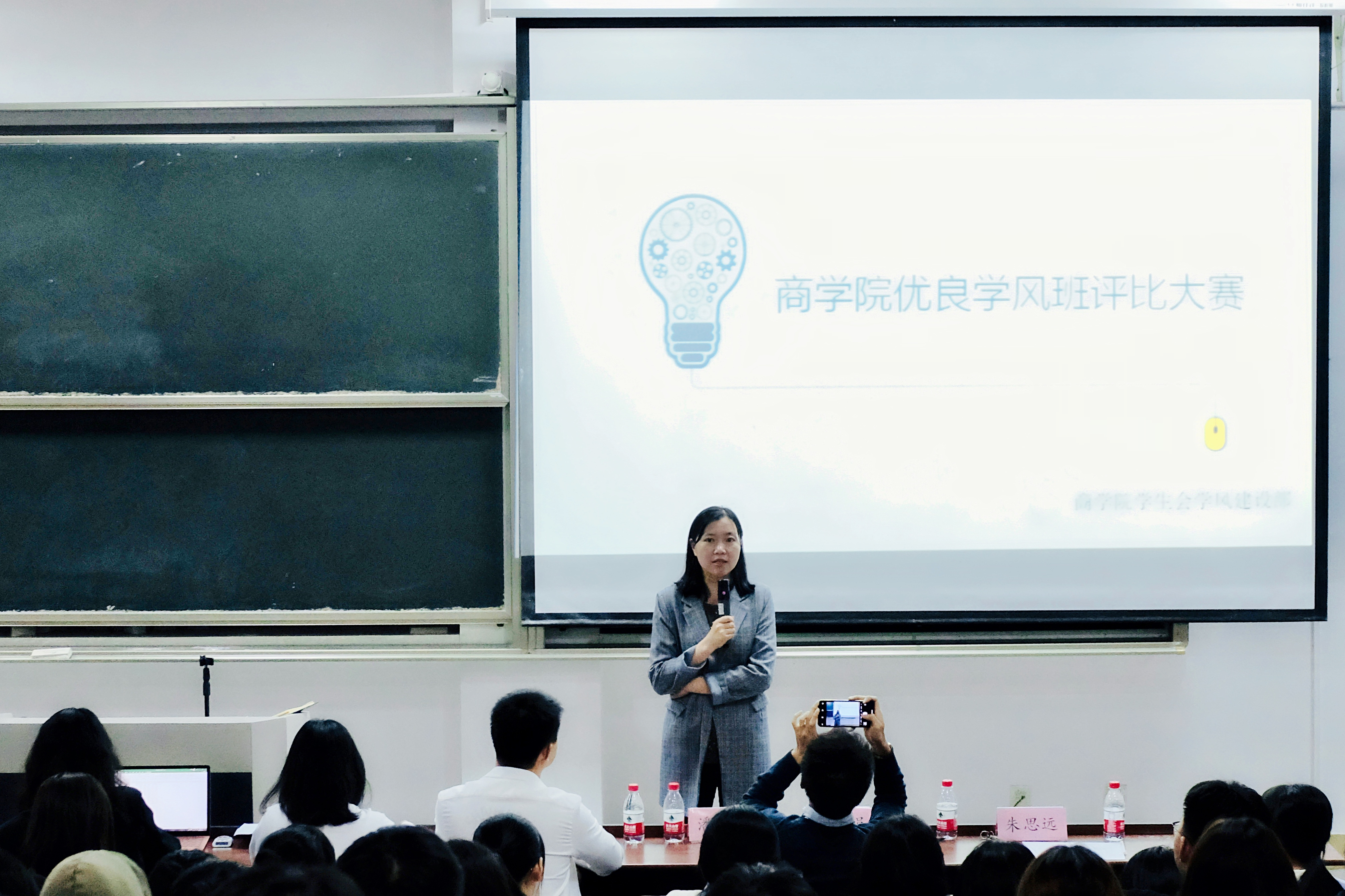 2020年10月21日晚,商学院于SF104举办优良学风班评比大赛。学院党委副书记周丽娟、学工办潘剑邦、赵昌志,学生会副主席谢雨希作为评委出席,2020级全体新生班委参与学习。