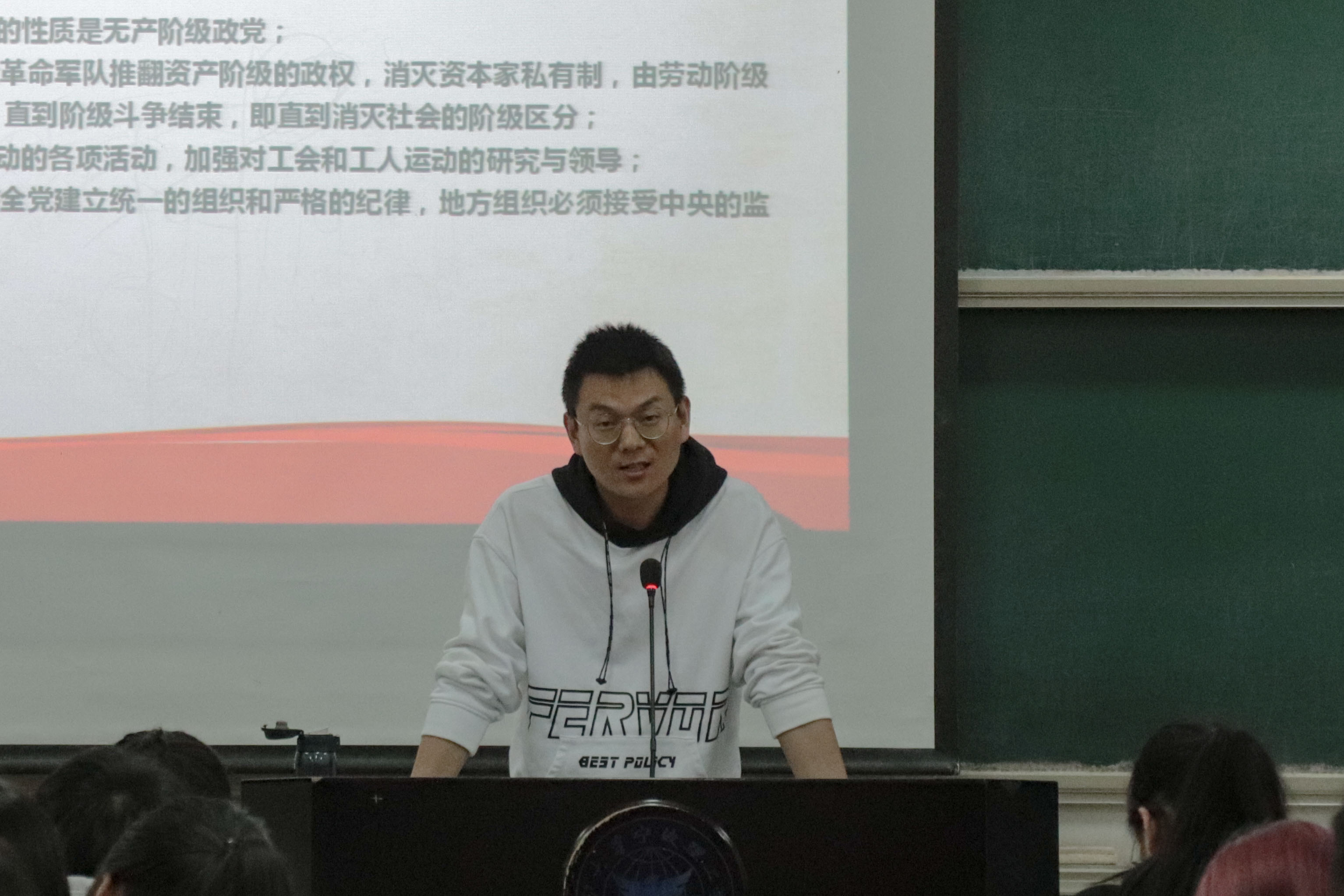 开班典礼后,陈鑫老师讲授培训班第一堂课《从苦难到辉煌:中共一大到十九大》。他以中国共产党第十九次次全国代表大会为主线,生动讲解了中国共产党发展道路上的艰辛,并由此阐明坚持党的领导是历史和人民的必然选择,积极鼓励同学加入中国共产党。