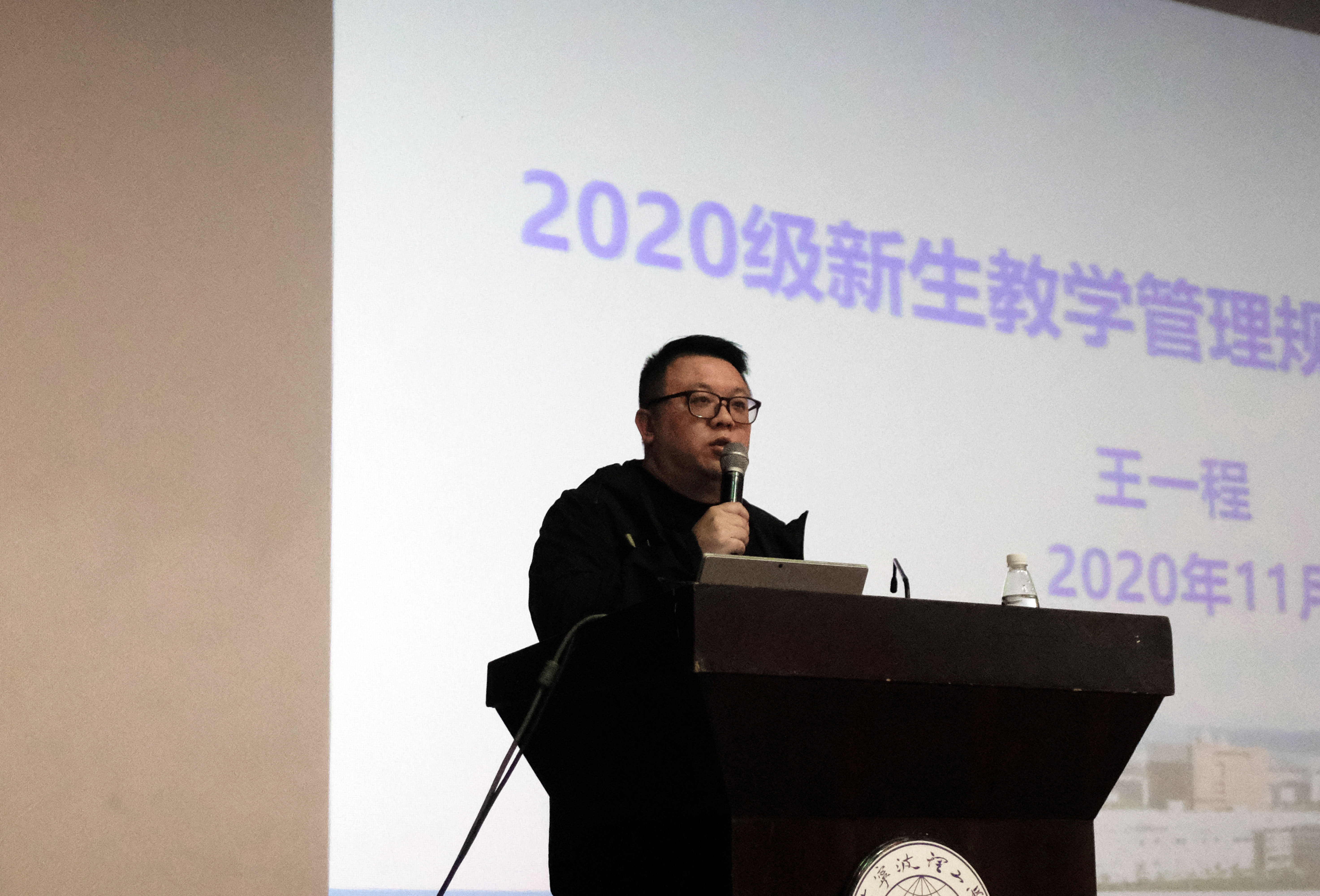 随后,教学主管王一程老师进行了教学管理规章制度教育。他从“学什么” “怎么学” “学习中要注意什么”这三个方面展开,介绍了选课方式、课程类别和要求、学分管理办法等。对照学生手册,逐条详细讲解了《浙大宁波理工学院本科学生学籍管理规定》。同时,希望同学不负青春,珍惜时光好好学习。