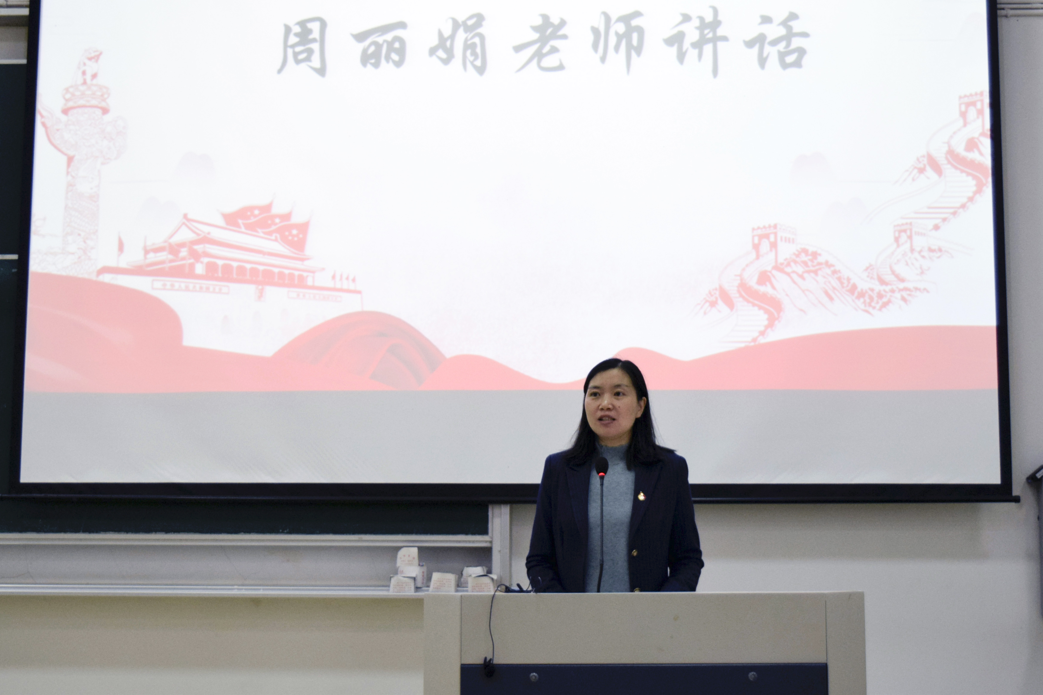 学院党委副书记周丽娟老师讲话。她首先对学院所有学生组织同学的辛苦付出表达了感谢,对一年以来学生组织在学院各项工作中做出的成绩表达了肯定。她强调,学生组织是锻炼的平台,但更是服务的平台,她对学生干部提出三点要求,一是不忘初心,树立学生干部的责任意识,聚焦学习主业。二是珍惜学生干部形象,牢记底线意识,以身作则,遵守承诺。三是不自恃,以慎独精神时刻要求自己,注重网络发言,用好社交平台,积极弘扬正能量。最后,她勉励与会的团学干部珍惜锻炼的机会,严格要求自己、努力服务同学。
